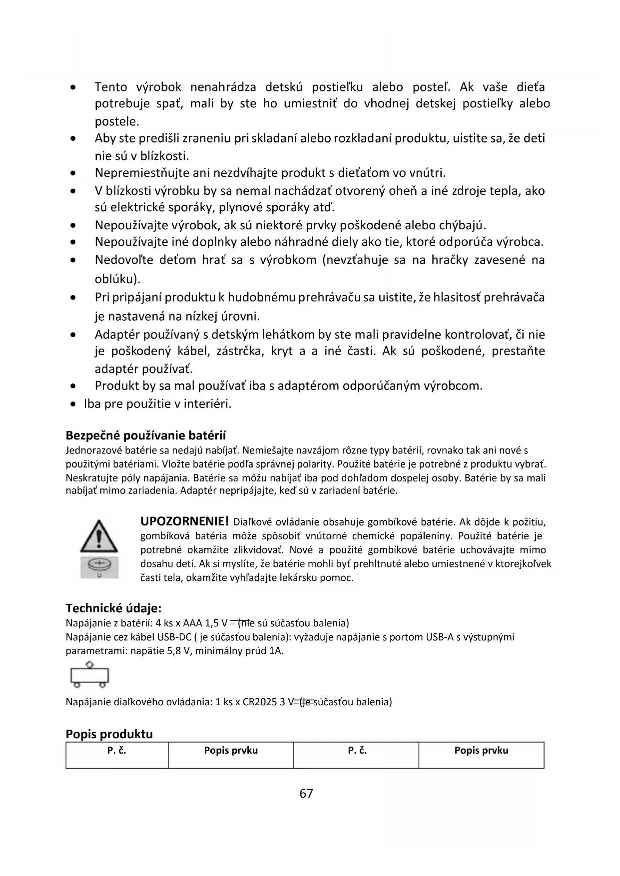 - Iba pre použitie v interiéri. Bezpečné používanie batérií Jednorazové batérie sa nedajú nabíjať. Nemiešajte navzájom rôzne typy batérií, rovnako tak ani nové s použitými batériami. Vložte batérie podľa správnej polarity. Použité batérie je potrebné z produktu vybrať. Neskratujte póly napájania. Batérie sa môžu nabíjať iba pod dohľadom dospelej osoby. Batérie by sa mali nabíjať mimo zariadenia. Adaptér nepripájajte, keď sú v zariadení batérie. UPOZORNENIE! Diaľkové ovládanie obsahuje gombíkové batérie. Ak dôjde k požitiu, gombíková batéria môže spôsobiť vnútorné chemické popáleniny. Použité batérie je potrebné okamžite zlikvidovať. Nové a použité gombíkové batérie uchovávajte mimo dosahu detí. Ak si myslíte, že batérie mohli byť prehltnuté alebo umiestnené v ktorejkoľvek časti tela, okamžite vyhľadajte lekársku pomoc. Technické údaje: Napájanie z batérií: 4 ks x AAA 1,5 V (nie sú súčasťou balenia) Napájanie cez kábel USB-DC ( je súčasťou balenia): vyžaduje napájanie s portom USB-A s výstupnými parametrami: napätie 5,8 V, minimálny prúd 1A. Napájanie diaľkového ovládania: 1 ks x CR2025 3 V (je súčasťou balenia) Popis produktu P. č. Popis prvku P. č. Popis prvku68