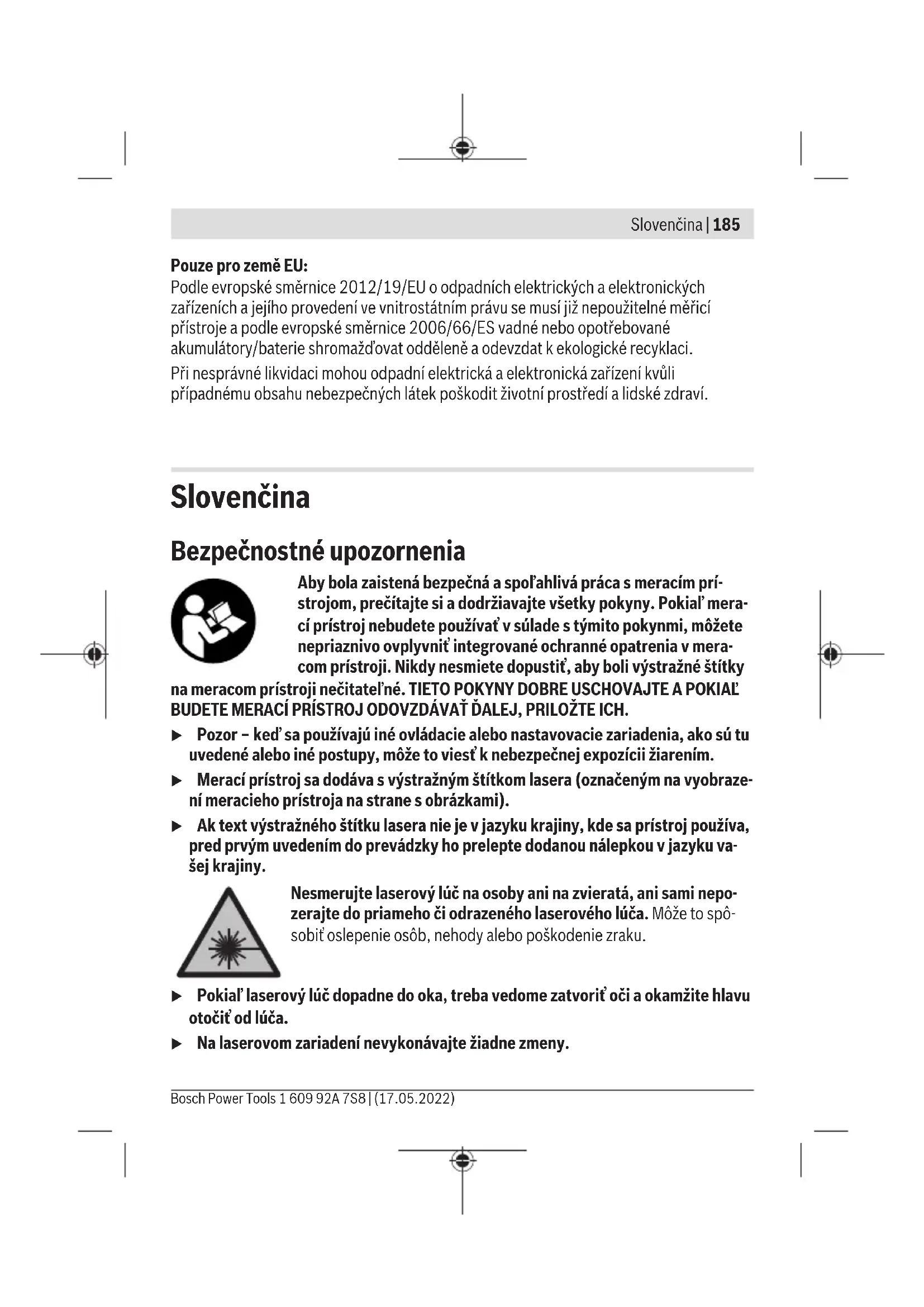 pri 20–25°C C) Uvedené hodnoty predpokladajú normálne až priaznivé podmienky okolia (napr. bez vibrácií, hmly, dymu, nepriameho slnečného žiarenia). Po silných teplotných výkyvoch môže dôjsť kod- chýlkam presnosti. D) Vyskytuje sa len nevodivé znečistenie, pričom sa však príležitostne očakáva dočasná vodivosť spôsobená kondenzáciou. Na jednoznačnú identifikáciu vášho meracieho prístroja slúži sériové číslo (9) uvedené na typovom štítku. Montáž Vkladanie/výmena batérií Na prevádzku meracieho prístroja sa odporúča používať alkalické mangánové batérie. Vprípade potreby otočte magnetický otočný držiak(3) nabok, aby bolo veko priehradky na batérie(6) voľné. Na otvorenie veka priehradky na batérie (6) zatlačte aretačný mechanizmus (5) smerom hore aodoberte veko priehradky na batérie. Vložte batérie. Dávajte pritom pozor na správnu polaritu podľa vyobrazenia na vnútornej strane prieh- radky na batérie. Opäť nasaďte veko priehradky na batérie (6) apevne ho zatlačte na označenom mieste cez aretáciu (5). Keď batérie slabnú, jas laserových bodov sa pomaly znižuje. Ak sú batérie takmer vybité, blikajú laserové body 5× za minútu. 1 609 92A 7S8 | (17.05.2022) Bosch Power ToolsSlovenčina | 189 Ak sú batérie vybité, laserové body zablikajú ešte raz apotom sa merací prístroj vypne. Vždy vymieňajte všetky batérie súčasne. Používajte len batérie od jedného výrobcu asrovnakou kapacitou. u Ak merací prístroj dlhší čas nepoužívate, batérie zneho vyberte. Batérie môžu pri dlhšom skladovaní vmeracom prístroji korodovať adochádza kich samočinnému vy- bíjaniu. Prevádzka Uvedenie do prevádzky u Merací prístroj chráňte pred vlhkom apred priamym slnečným žiarením. u Merací prístroj nevystavujte extrémnym teplotám alebo teplotným výkyvom. Nenechávajte ho napríklad dlhší čas ležať vautomobile. Pri väčších teplotných výky- voch nechajte merací prístroj najprv zahriať avždy vykonajte skúšku presnosti (pozri „Skúška presnosti meracieho prístroja“, Stránka190). Pri extrémnych teplotách alebo vprípade kolísania teplôt môže byť negatívne ovplyv- nená presnosť meracieho prístroja. u Zabráňte silným nárazom alebo pádom meracieho prístroja. Pri silných vonkajších vplyvoch by ste mali pred ďalšou prácou vykonať skúšku presnosti meracieho prí- stroja (pozri „Skúška presnosti meracieho prístroja“, Stránka190). u Keď merací prístroj prepravujete, vypnite ho. Pri vypnutí sa výkyvná jednotka za- blokuje, inak by sa mohla pri prudšom pohybe poškodiť. Zapínanie/vypínanie Merací prístroj zapnete tak, že posuniete vypínač (2) do polohy ON. Merací prístroj okamžite po zapnutí vysiela laserové lúče zvýstupných otvorov (1). u Nesmerujte laserový lúč na osoby ani na zvieratá, ani sa sami nepozerajte do la- serového lúča, dokonca ani z väčšej vzdialenosti. Merací prístroj vypnete tak, že posuniete vypínač (2) do polohy OFF. Pri vypnutí sa vý- kyvná jednotka zablokuje. u Zapnutý merací prístroj nenechávajte bez dozoru a po použití ho vždy vypnite. Laserový lúč by mohol oslepiť iné osoby. Pri prekročení maximálnej prípustnej prevádzkovej teploty 45 °C dôjde kvypnutiu zdô- vodu ochrany laserovej diódy. Po vychladnutí je merací prístroj opäť pripravený na pre- vádzku amožno ho znova zapnúť. Vypínacia automatika Merací prístroj sa po 60min prevádzky automaticky vypne. Bosch Power Tools 1 609 92A 7S8 | (17.05.2022)190 | Slovenčina Vypínacia automatika sa obnoví na 60min, keď sa zapnutý merací prístroj nachádza mimo rozsahu samonivelácie (laserové body trvalo blikajú). Nivelačná automatika Merací prístroj postavte na vodorovný, pevný podklad alebo ho upevnite na statív(11). Na použitie spodného laserového bodu otočte merací prístroj na magnetickom otočnom držiaku(3) tak, aby bol laserový bod viditeľný na podlahe. Nivelačná automatika po zapnutí automaticky vyrovná nerovnosti vrámci samonivelačné- ho rozsahu ±4°. Nivelácia je ukončená, keď laserové body trvalo svietia auž sa nepohy- bujú. Ak nie je možná automatická nivelácia, napr. plocha na postavenie meracieho prístroja má odchýlku od horizontály viac ako 4°, laserové body blikajú vrýchlom slede. Vtakomto prípade postavte merací prístroj vodorovne apočkajte na samoniveláciu. Hneď ako sa merací prístroj nachádza vrámci samonivelačného rozsahu ±4°, laserové body svietia neprerušovane. Pri otrasoch azmenách polohy počas prevádzky sa merací prístroj znova automaticky vy- niveluje. Po novej nivelácii skontrolujte polohu vodorovného, príp. zvislého laserového bodu vzhľadom na referenčné body, aby sa zabránilo chybám presunutím meracieho prí- stroja. Skúška presnosti meracieho prístroja Faktory ovplyvňujúce presnosť Najväčší vplyv na presnosť merania má teplota okolia. Najmä rozdiely teploty prechádza- júce od zeme smerom hore môžu spôsobovať vychýlenie laserového lúča. Pretože teplotné vrstvy sú v blízkosti zeme najväčšie, mali by ste merací prístroj pri vzdialenostiach od 20 m vždy namontovať na statív. Okrem toho umiestnite podľa mož- nosti merací prístroj do stredu pracovnej plochy. Okrem vonkajších vplyvov môžu k odchýlkam viesť aj vplyvy špecifické pre daný prístroj (ako sú napríklad pády alebo prudké nárazy). Preto pred začiatkom každej práce skon- trolujte presnosť nivelácie. Ak by merací prístroj pri jednej zuvedených skúšok prekračoval maximálnu povolenú od- chýlku, dajte ho opraviť vautorizovanom servise firmy Bosch. Kontrola presnosti vodorovnej nivelácie Na túto kontrolu budete potrebovať voľnú meraciu trasu 5m na pevnom podklade medzi dvoma stenami A aB. – Namontujte merací prístroj vhorizontálnej polohe blízko stenyA na stat