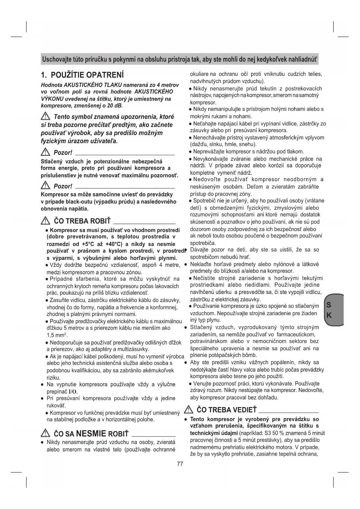 Hodnota AKUSTICKÉHO TLAKU nameraná zo 4 metrov vo voľnom poli sa rovná hodnote AKUSTICKÉHO VÝKONU uvedenej na štítku, ktorý je umiestnený na kompresore, zmenšenej o 20 dB. Tento symbol znamená upozornenia, ktoré si treba pozorne prečítať predtým, ako začnete používať výrobok, aby sa predišlo možným fyzickým úrazom užívateľa. Pozor! Stlačený vzduch je potenzionálne nebezpečná forma energie, preto pri používaní kompresora a príslušenstiev je nutné venovať maximálnu pozornosť. Pozor! Kompresor sa môže samočinne uviesť do prevádzky v prípade black-outu (výpadku prúdu) a nasledovného obnovenia napätia.