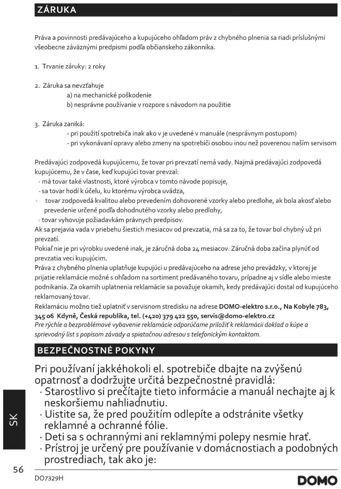 - tovar vyhovuje požiadavkám právnych predpisov. Ak sa prejavia vada v priebehu šiestich mesiacov od prevzatia, má sa za to, že tovar bol chybný už pri prevzatí. Pokiaľ nie je pri výrobku uvedené inak, je záručná doba 24 mesiacov. Záručná doba začína plynúť od prevzatia veci kupujúcim. Práva z chybného plnenia uplatňuje kupujúci u predávajúceho na adrese jeho prevádzky, v ktorej je prijatie reklamácie možné s ohľadom na sortiment predávaného tovaru, prípadne aj v sídle alebo mieste podnikania. Za okamih uplatnenia reklamácie sa považuje okamih, kedy predávajúci dostal od kupujúceho reklamovaný tovar. Reklamáciu možno tiež uplatniť v servisnom stredisku na adrese DOMO-elektro s.r.o., Na Kobyle 783, 345 06 Kdyně, Česká republika, tel. (+420) 379 422 550, servis@domo-elektro.cz Pre rýchle a bezproblémové vybavenie reklamácie odporúčame priložiť k reklamácii doklad o kúpe a sprievodný list s popisom závady a spiatočnou adresou s telefonickým kontaktom.