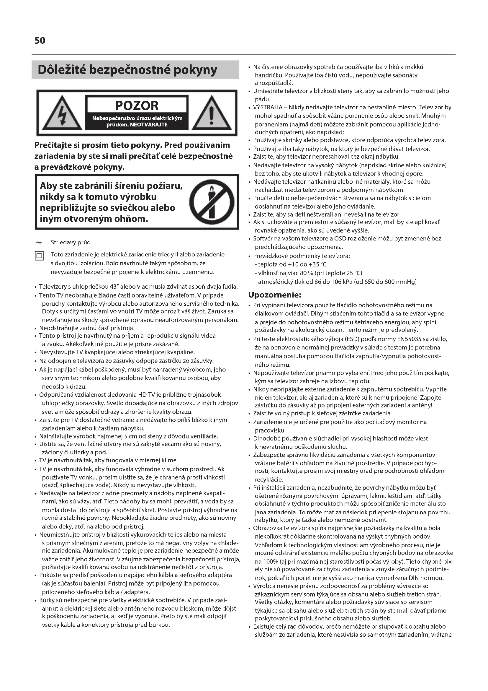 nechejte vyhledat pořad ke sledování.SK Dôležité bezpečnostné pokyny POZOR Nebezpečenstvo úrazu elektrickýmprúdom. NEOTVÁRAJTE Prečítajte si prosím tieto pokyny. Pred používaním zariadenia by ste si mali prečítať celé bezpečnostné aprevádzkové pokyny. Aby ste zabránili šíreniu požiaru, nikdy sa k tomuto výrobku nepribližujte so sviečkou alebo iným otvoreným ohňom. Striedavý prúd Toto zariadenie je elektrické zariadenie triedy II alebo zariadenie sdvojitou izoláciou. Bolo navrhnuté takým spôsobom, že nevyžaduje bezpečné pripojenie kelektrickému uzemneniu.