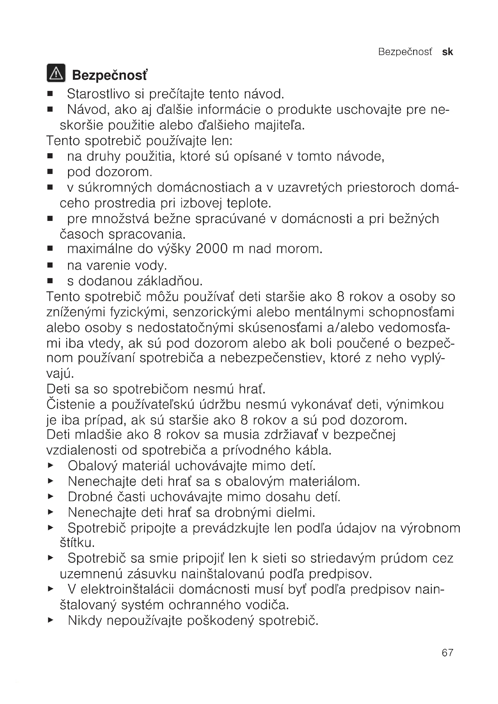 Bezpečnosť ¡ Starostlivo si prečítajte tento návod. ¡ Návod, ako aj ďalšie informácie oprodukte uschovajte pre ne- skoršie použitie alebo ďalšieho majiteľa. Tento spotrebič používajte len: ¡ na druhy použitia, ktoré sú opísané v tomto návode, ¡ pod dozorom. ¡ vsúkromných domácnostiach avuzavretých priestoroch domá- ceho prostredia pri izbovej teplote. ¡ pre množstvá bežne spracúvané vdomácnosti apri bežných časoch spracovania. ¡ maximálne do výšky 2000m nad morom. ¡ na varenie vody. ¡ s dodanou základňou. Tento spotrebič môžu používať deti staršie ako 8rokov aosoby so zníženými fyzickými, senzorickými alebo mentálnymi schopnosťami alebo osoby snedostatočnými skúsenosťami a/alebo vedomosťa- mi iba vtedy, ak sú pod dozorom alebo ak boli poučené obezpeč- nom používaní spotrebiča anebezpečenstiev, ktoré zneho vyplý- vajú. Deti sa so spotrebičom nesmú hrať. Čistenie apoužívateľskú údržbu nesmú vykonávať deti, výnimkou je iba prípad, ak sú staršie ako 8rokov asú pod dozorom. Deti mladšie ako 8 rokov sa musia zdržiavať vbezpečnej vzdialenosti od spotrebiča aprívodného kábla. ▶ Obalový materiál uchovávajte mimo detí. ▶ Nenechajte deti hrať sa sobalovým materiálom. ▶ Drobné časti uchovávajte mimo dosahu detí. ▶ Nenechajte deti hrať sa drobnými dielmi. ▶ Spotrebič pripojte aprevádzkujte len podľa údajov na výrobnom štítku. ▶ Spotrebič sa smie pripojiť len ksieti so striedavým prúdom cez uzemnenú zásuvku nainštalovanú podľa predpisov. ▶ Velektroinštalácii domácnosti musí byť podľa predpisov nain- štalovaný systém ochranného vodiča. ▶ Nikdy nepoužívajte poškodený spotrebič.sk Zabránenie vecným škodám
