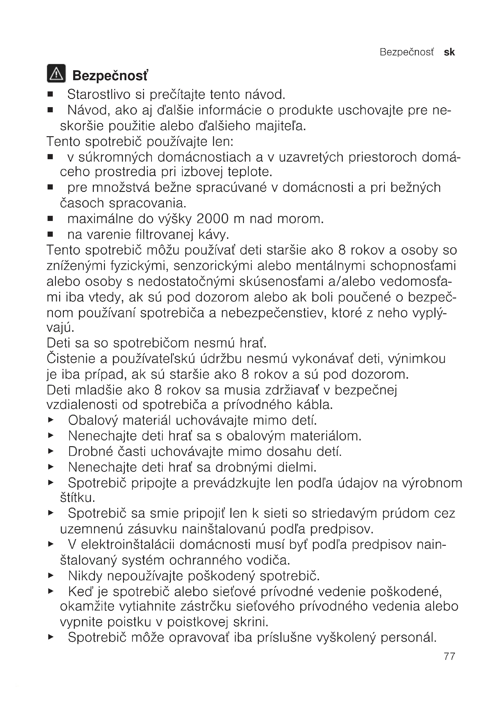 Bezpečnosť ¡ Starostlivo si prečítajte tento návod. ¡ Návod, ako aj ďalšie informácie oprodukte uschovajte pre ne- skoršie použitie alebo ďalšieho majiteľa. Tento spotrebič používajte len: ¡ vsúkromných domácnostiach avuzavretých priestoroch domá- ceho prostredia pri izbovej teplote. ¡ pre množstvá bežne spracúvané vdomácnosti apri bežných časoch spracovania. ¡ maximálne do výšky 2000m nad morom. ¡ na varenie filtrovanej kávy. Tento spotrebič môžu používať deti staršie ako 8rokov aosoby so zníženými fyzickými, senzorickými alebo mentálnymi schopnosťami alebo osoby snedostatočnými skúsenosťami a/alebo vedomosťa- mi iba vtedy, ak sú pod dozorom alebo ak boli poučené obezpeč- nom používaní spotrebiča anebezpečenstiev, ktoré zneho vyplý- vajú. Deti sa so spotrebičom nesmú hrať. Čistenie apoužívateľskú údržbu nesmú vykonávať deti, výnimkou je iba prípad, ak sú staršie ako 8rokov asú pod dozorom. Deti mladšie ako 8 rokov sa musia zdržiavať vbezpečnej vzdialenosti od spotrebiča aprívodného kábla. ▶ Obalový materiál uchovávajte mimo detí. ▶ Nenechajte deti hrať sa sobalovým materiálom. ▶ Drobné časti uchovávajte mimo dosahu detí. ▶ Nenechajte deti hrať sa drobnými dielmi. ▶ Spotrebič pripojte aprevádzkujte len podľa údajov na výrobnom štítku. ▶ Spotrebič sa smie pripojiť len ksieti so striedavým prúdom cez uzemnenú zásuvku nainštalovanú podľa predpisov. ▶ Velektroinštalácii domácnosti musí byť podľa predpisov nain- štalovaný systém ochranného vodiča. ▶ Nikdy nepoužívajte poškodený spotrebič. ▶ Keď je spotrebič alebo sieťové prívodné vedenie poškodené, okamžite vytiahnite zástrčku sieťového prívodného vedenia alebo vypnite poistku vpoistkovej skrini. ▶ Spotrebič môže opravovať iba príslušne vyškolený personál.sk Zabránenie vecným škodám