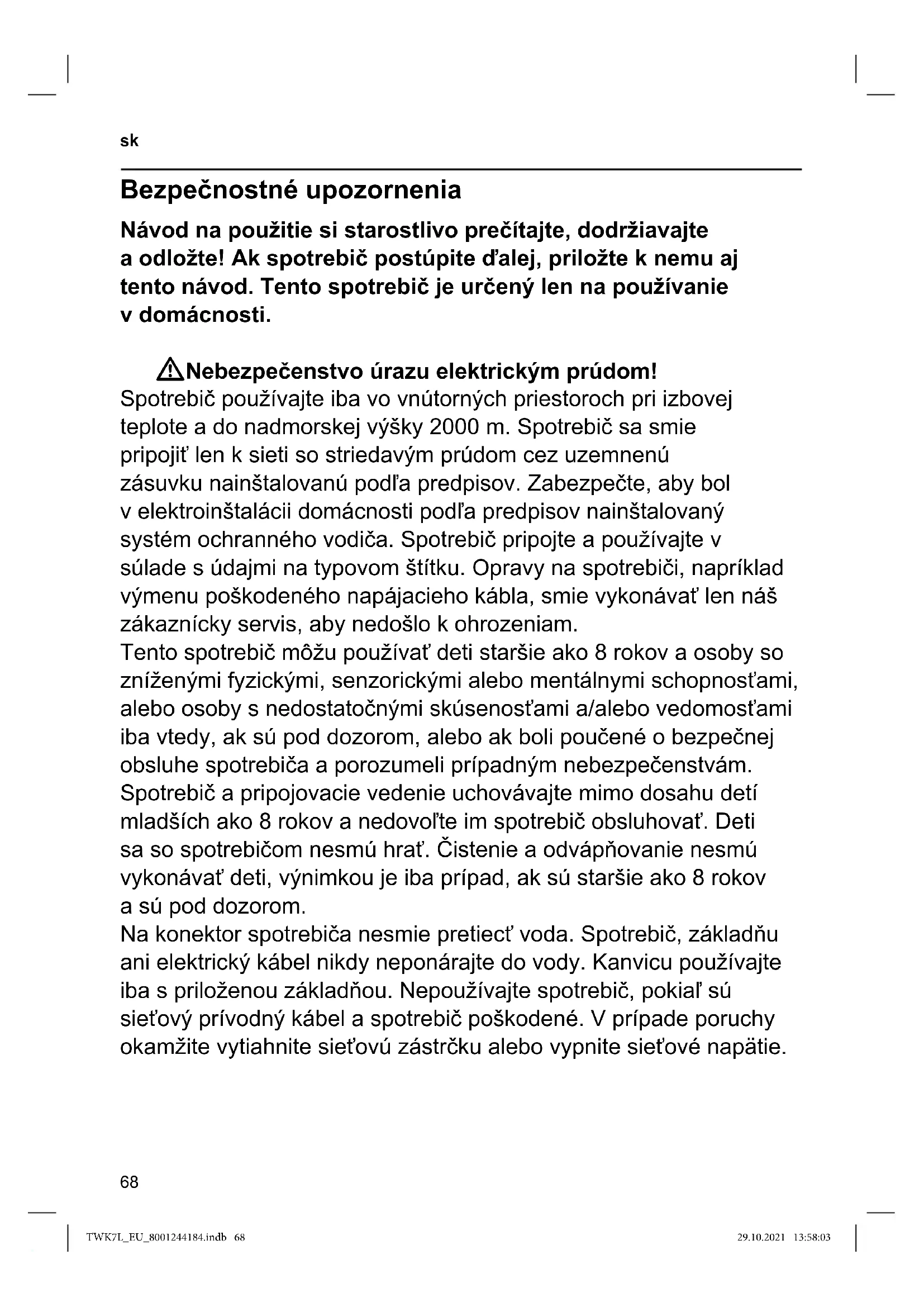 VAROVANIE: Tento prístroj nepoužívajte v blízkosti vaní, spŕch, umývadiel alebo iných nádob, ktoré obsahujú vodu. WNebezpečenstvo udusenia! Nedovoľte deťom hrať sa s obalovým materiálom. WNebezpečenstvo poranenia! Nesprávne používanie spotrebiča môže mať za následok poranenia. WPozor! Čistenie plôch, ktoré prichádzajú do styku s potravinami! Rešpektujte špeciálne pokyny na čistenie uvedené v obrázkovom návode. TWK7L_EU_8001244184.indb 68TWK7L_EU_8001244184.indb 68 29.10.2021 13:58:0329.10.2021 13:58:0369