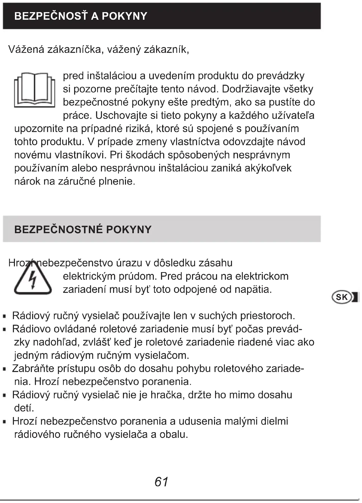 Vážená zákazníčka, vážený zákazník, pred inštaláciou a uvedením produktu do prevádzky si pozorne prečítajte tento návod. Dodržiavajte všetky bezpečnostné pokyny ešte predtým, ako sa pustíte do práce. Uschovajte si tieto pokyny a každého užívateľa upozornite na prípadné riziká, ktoré sú spojené s používaním tohto produktu V prípade zmeny vlastníctva odovzdajte návod novému vlastníkovi. Pri škodách spôsobených nesprávnym používaním alebo nesprávnou inštaláciou zaniká akýkoľvek nárok na záručné plnenie.