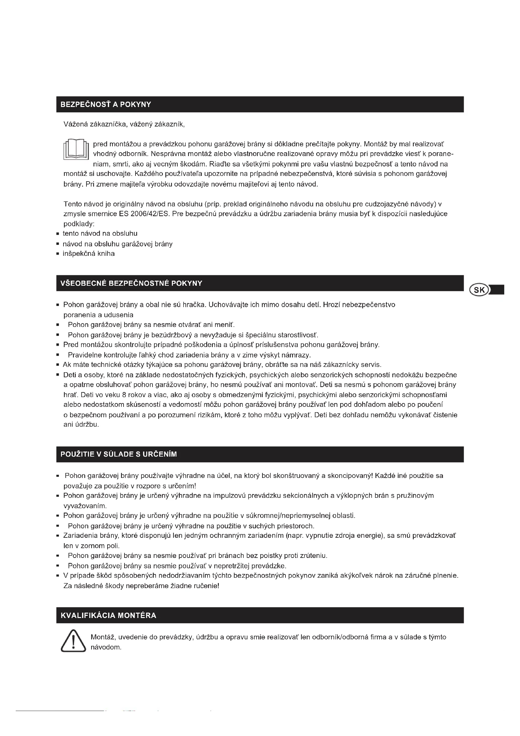 Vážená zákazníčka, vážený zákazník, pred montážou a prevádzkou pohonu garážovej brány si dôkladne prečítajte pokyny. Montáž by mal realizovať vhodný odborník. Nesprávna montáž alebo vlastnoručne realizované opravy môžu pri prevádzke viesť k porane- niam, smrti, ako aj vecným škodám. Riaďte sa všetkými pokynmi pre vašu vlastnú bezpečnosť a tento návod na montáž si uschovajte. Každého používateľa upozornite na prípadné nebezpečenstvá, ktoré súvisia s pohonom garážovej brány. Pri zmene majiteľa výrobku odovzdajte novému majiteľovi aj tento návod. Tento návod je originálny návod na obsluhu (príp. preklad originálneho návodu na obsluhu pre cudzojazyčné návody) v zmysle smernice ES 2006/42/ES. Pre bezpečnú prevádzku a údržbu zariadenia brány musia byť k dispozícii nasledujúce podklady: tento návod na obsluhu návod na obsluhu garážovej brány inšpekčná kniha