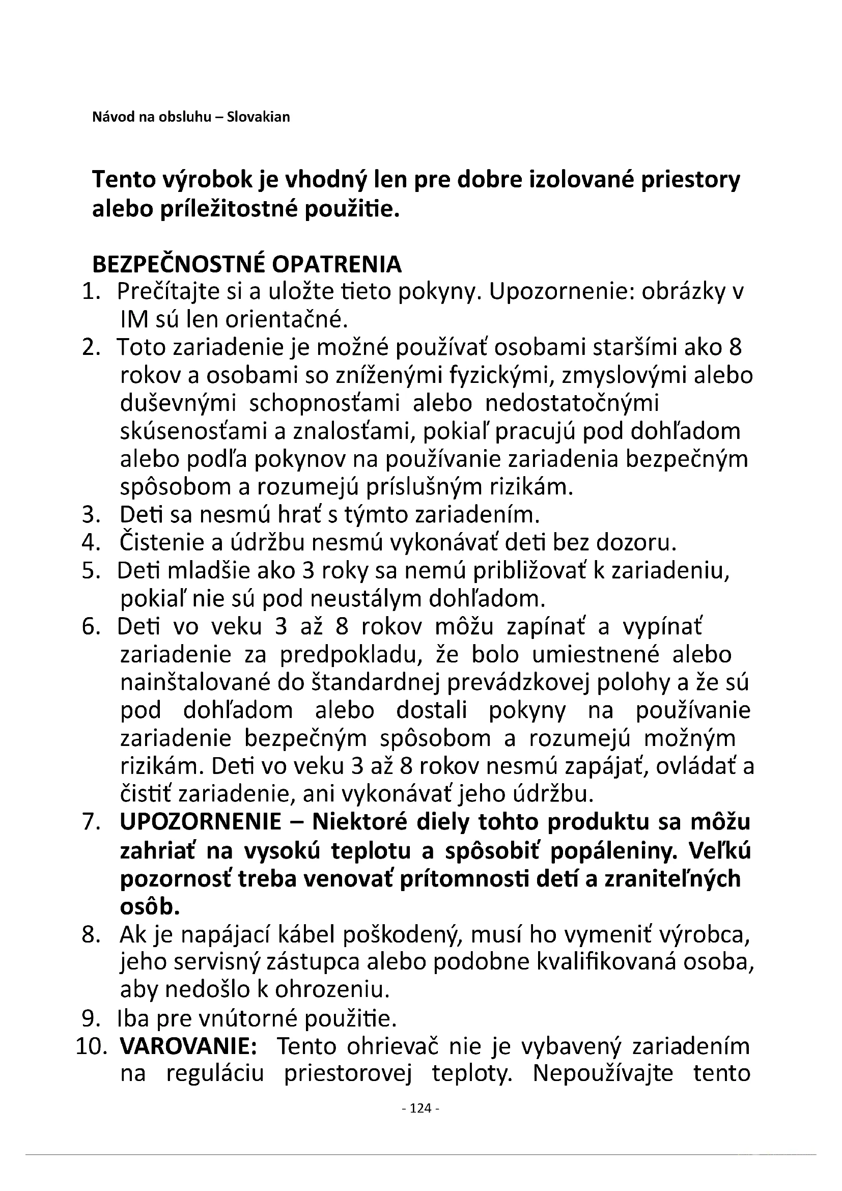 na reguláciu priestorovej teploty. Nepoužívajte tento- 125 - ohrievač v malých miestnostiach, v ktorých sú prítomné osoby neschopné samostatne opustiť miestnosť, pokiaľ nie sú pod neustálym dohľadom.