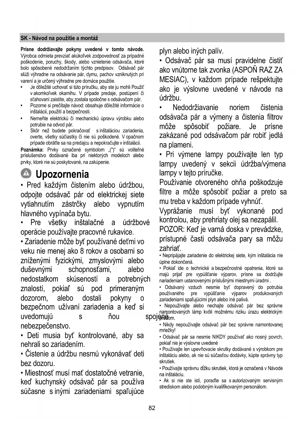 - Miestnosť musí mať dostatočné vetranie, keď kuchynský odsávač pár sa používa súčasne s inými zariadeniami spaľujúce plyn alebo iných palív.