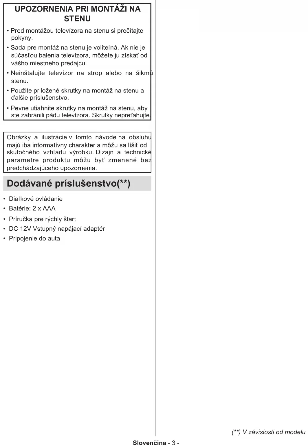 - Pevne utiahnite skrutky na montáž na stenu, aby ste zabránili pádu televízora. Skrutky nepreťahujte. Obrázky a ilustrácie v tomto návode na obsluhu majú iba informatívny charakter a môžu sa líšiť od skutočného vzhľadu výrobku. Dizajn a technické parametre produktu môžu byť zmenené bez predchádzajúceho upozornenia. Dodávané príslušenstvo(**)