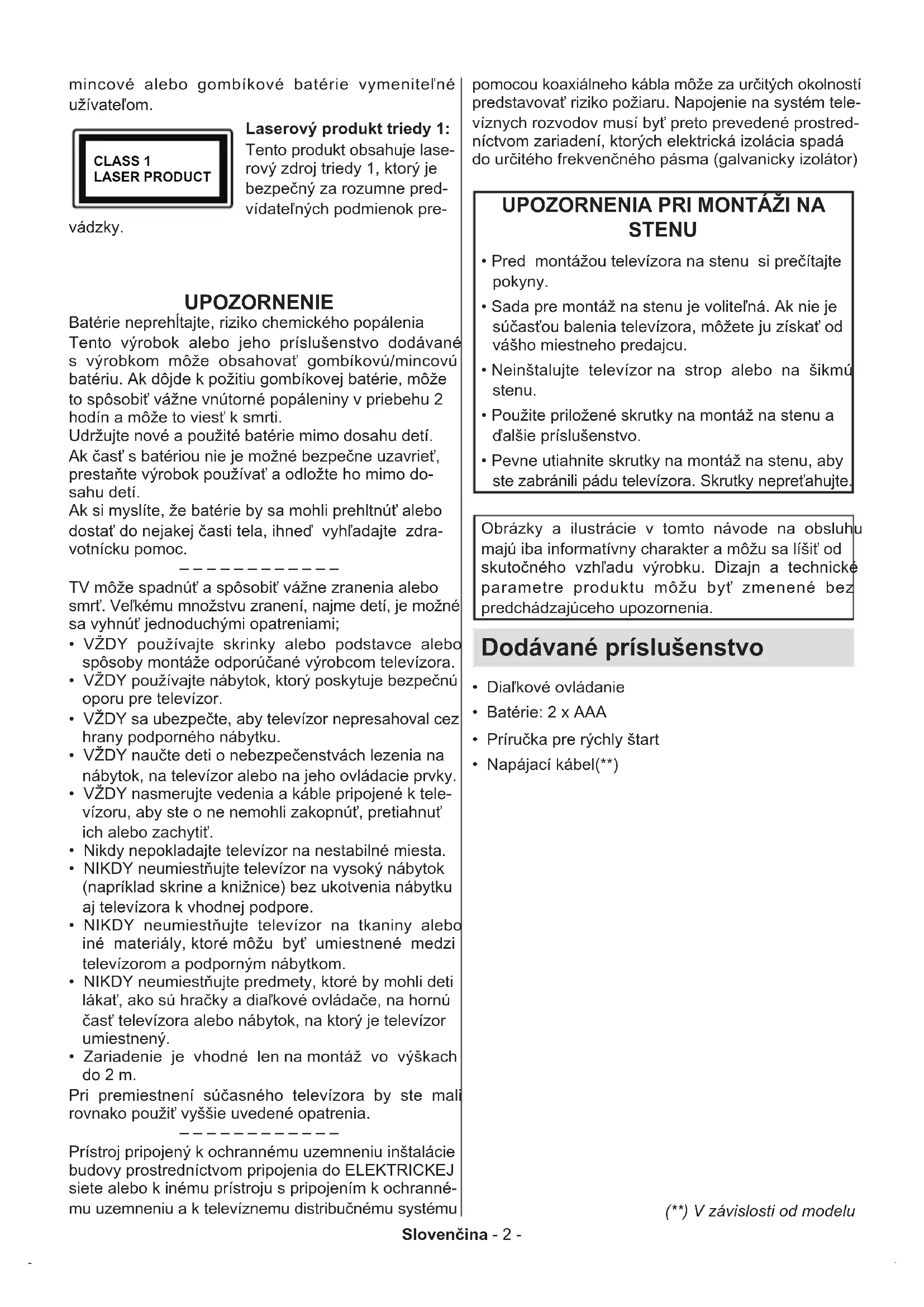 Pozor, Pozri návod na obsluhu: V Slovenčina - 2 - mincové alebo gombíkové batérie vymeniteľné užívateľom. CLASS 1 LASER PRODUCT Laserový produkt triedy 1: Tento produkt obsahuje lase- rový zdroj triedy 1, ktorý je bezpečný za rozumne pred- vídateľných podmienok pre- vádzky. UPOZORNENIE Batérie neprehĺtajte, riziko chemického popálenia Tento výrobok alebo jeho príslušenstvo dodávané s výrobkom môže obsahovať gombíkovú/mincovú batériu. Ak dôjde k požitiu gombíkovej batérie, môže to spôsobiť vážne vnútorné popáleniny v priebehu 2 hodín a môže to viesť k smrti. Udržujte nové a použité batérie mimo dosahu detí. Ak časť s batériou nie je možné bezpečne uzavrieť, prestaňte výrobok používať a odložte ho mimo do- sahu detí. Ak si myslíte, že batérie by sa mohli prehltnúť alebo dostať do nejakej časti tela, ihneď vyhľadajte zdra- votnícku pomoc. – – – – – – – – – – – – TV môže spadnúť a spôsobiť vážne zranenia alebo smrť. Veľkému množstvu zranení, najme detí, je možné sa vyhnúť jednoduchými opatreniami;