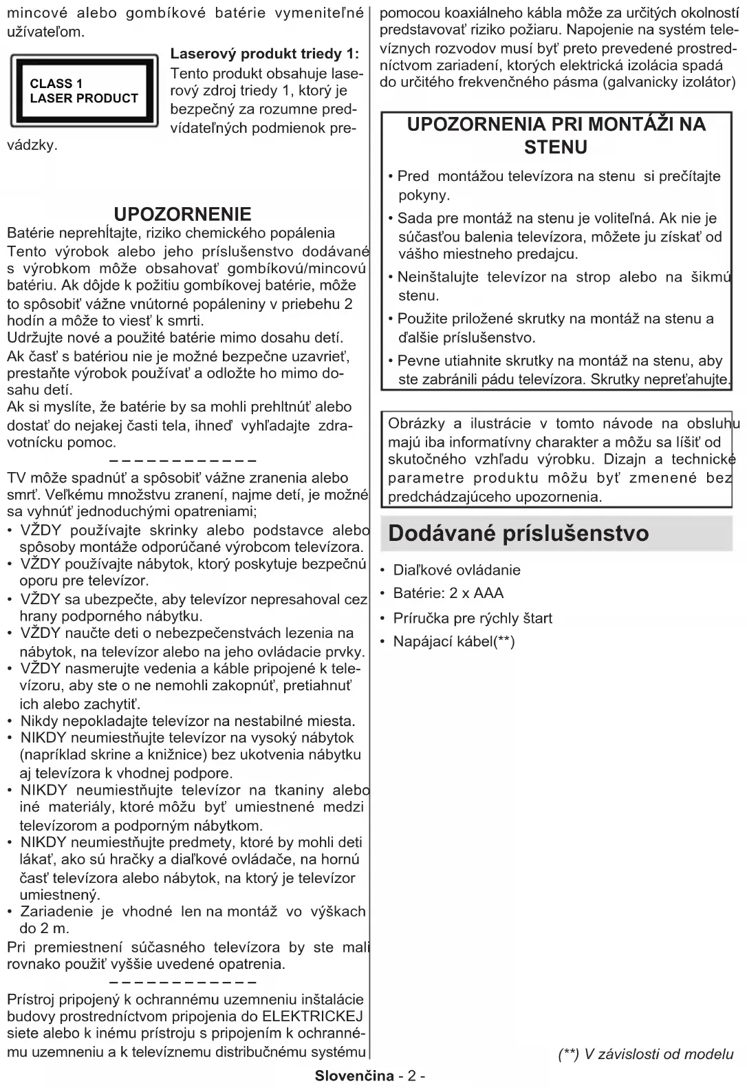 Pozor, Pozri návod na obsluhu: V Slovenčina - 2 - mincové alebo gombíkové batérie vymeniteľné užívateľom. CLASS 1 LASER PRODUCT Laserový produkt triedy 1: Tento produkt obsahuje lase- rový zdroj triedy 1, ktorý je bezpečný za rozumne pred- vídateľných podmienok pre- vádzky. UPOZORNENIE Batérie neprehĺtajte, riziko chemického popálenia Tento výrobok alebo jeho príslušenstvo dodávané s výrobkom môže obsahovať gombíkovú/mincovú batériu. Ak dôjde k požitiu gombíkovej batérie, môže to spôsobiť vážne vnútorné popáleniny v priebehu 2 hodín a môže to viesť k smrti. Udržujte nové a použité batérie mimo dosahu detí. Ak časť s batériou nie je možné bezpečne uzavrieť, prestaňte výrobok používať a odložte ho mimo do- sahu detí. Ak si myslíte, že batérie by sa mohli prehltnúť alebo dostať do nejakej časti tela, ihneď vyhľadajte zdra- votnícku pomoc. – – – – – – – – – – – – TV môže spadnúť a spôsobiť vážne zranenia alebo smrť. Veľkému množstvu zranení, najme detí, je možné sa vyhnúť jednoduchými opatreniami;