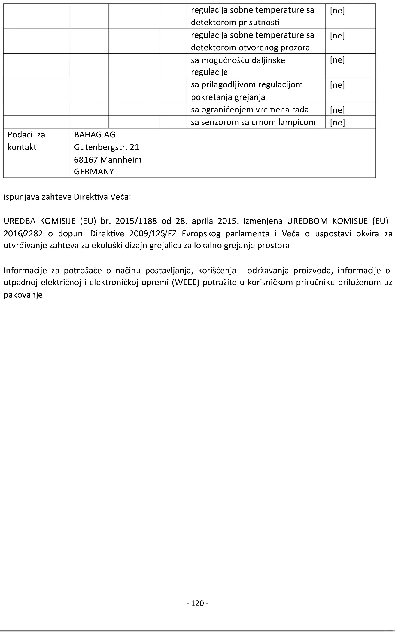Spĺňa požiadavky smerníc Rady: NARIADENIE KOMISIE (EÚ) č. 2015/1188 zo dňa 28. apríla 2015, ktorým sa mení NARIADENIE KOMISIE (EÚ ) 2016/2282 a ktorým sa implementuje smernica 2009/125/ES Európskeho parlamentu a Rady o požiadavkách na ekodizajn lokálnych ohrievačov Čo sa týka informovania spotrebiteľov o tom, ako inštalovať, používať a udržiavať výrobok a informácie o OEEZ si pozrite v návode na obsluhu dodanom s balením.- 128 - Priročnik za uporabo – Slovenian Ta izdelek je primeren le za dobro izolirane prostore ali občasno uporabo. VARNOSTNA NAVODILA