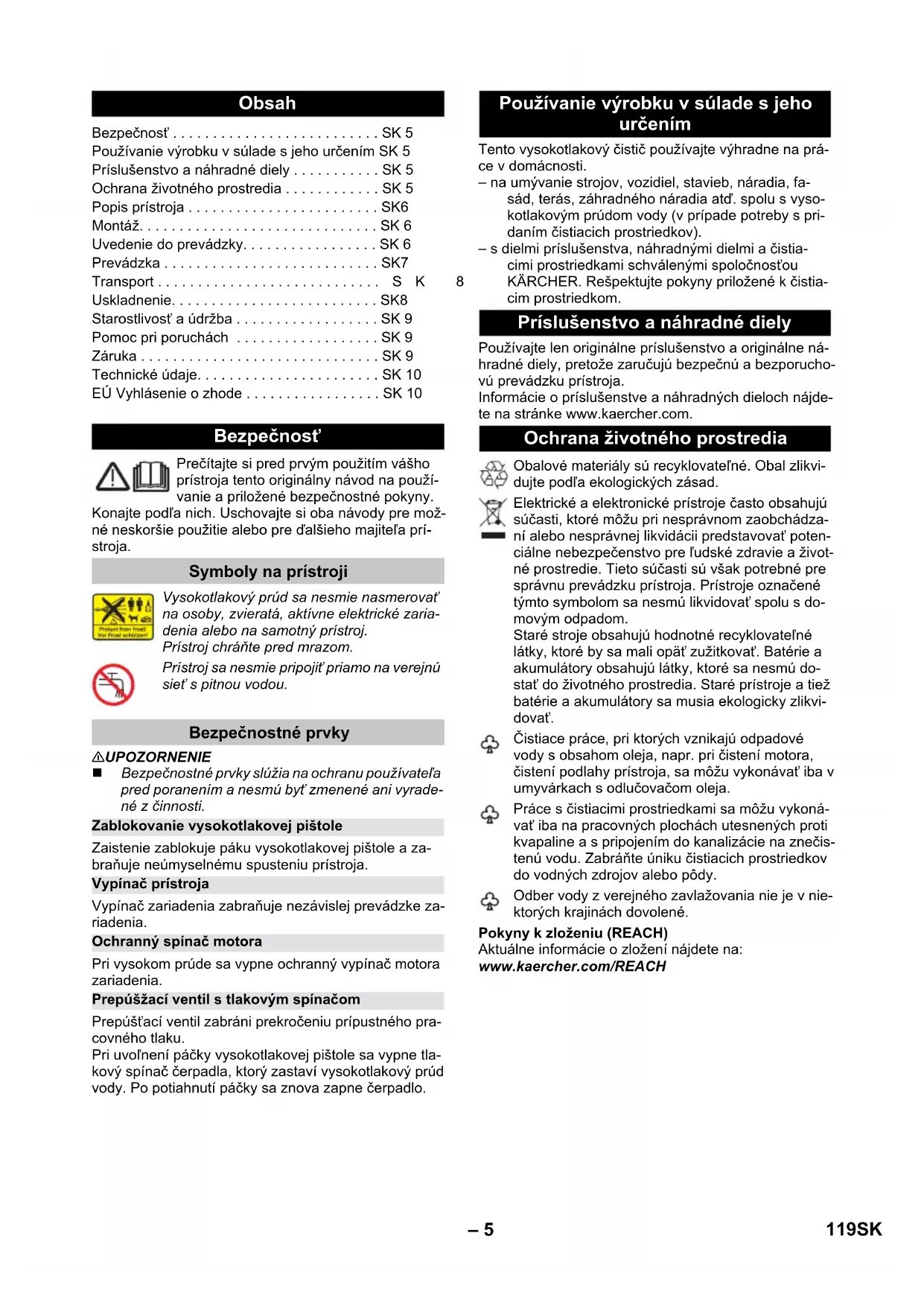 95 dB(A) Motivul excepției conform Regulamentului (UE) 2019/ 1781 anexa I secțiunea 2 punctul (12): j) Se rezervă dreptul la modificări tehnice. Declaraţie UE de conformitate Produs: Aparat de curăţare sub presiune Tip: K 6 Special Directive UE respectate: 2006/42/CE (+2009/127/CE) 2014/30/UE 2011/65/UE 2000/14/CE 2009/125/CE Regulamente aplicabile (UE) 2019/1781 Norme armonizate utilizate: EN 60335–1 EN 60335–2–79 EN 62233: 2008 EN 55014–1: 2017 + A11: 2020 EN 55014–2: 2015 EN 61000–3–2: 2014 EN 61000–3–11: 2000 EN IEC 63000: 2018 Procedura de evaluare a conformităţii: 2000/14/CE: Anexa V Nivel de zgomot dB(A) măsurat: 92 garantat: 95 Winnenden, 2021/06/01 Chairman of the Board of Management Director Regulatory Affairs & Certification 118 RO– 5 Prečítajte si pred prvým použitím vášho prístroja tento originálny návod na použí- vanie a priložené bezpečnostné pokyny. Konajte podľa nich. Uschovajte si oba návody pre mož- né neskoršie použitie alebo pre ďalšieho majiteľa prí- stroja. 몇 UPOZORNENIE Bezpečnostné prvky slúžia na ochranu používateľa pred poranením a nesmú byť zmenené ani vyrade- né z činnosti. Zaistenie zablokuje páku vysokotlakovej pištole a za- braňuje neúmyselnému spusteniu prístroja. Vypínač zariadenia zabraňuje nezávislej prevádzke za- riadenia. Pri vysokom prúde sa vypne ochranný vypínač motora zariadenia. Prepúšťací ventil zabráni prekročeniu prípustného pra- covného tlaku. Pri uvoľnení páčky vysokotlakovej pištole sa vypne tla- kový spínač čerpadla, ktorý zastaví vysokotlakový prúd vody. Po potiahnutí páčky sa znova zapne čerpadlo. Tento vysokotlakový čistič používajte výhradne na prá- ce v domácnosti. – na umývanie strojov, vozidiel, stavieb, náradia, fa- sád, terás, záhradného náradia atď. spolu s vyso- kotlakovým prúdom vody (v prípade potreby s pri- daním čistiacich prostriedkov). – s dielmi príslušenstva, náhradnými dielmi a čistia- cimi prostriedkami schválenými spoločnosťou KÄRCHER. Rešpektujte pokyny priložené k čistia- cim prostriedkom. Používajte len originálne príslušenstvo a originálne ná- hradné diely, pretože zaručujú bezpečnú a bezporucho- vú prevádzku prístroja. Informácie o príslušenstve a náhradných dieloch nájde- te na stránke www.kaercher.com. Pokyny k zloženiu (REACH) Aktuálne informácie o zložení nájdete na: www.kaercher.com/REACH Obsah Bezpečnosť . . . . . . . . . . . . . . . . . . . . . . . . . . SK 5 Používanie výrobku v súlade s jeho určením SK 5 Príslušenstvo a náhradné diely . . . . . . . . . . . SK 5 Ochrana životného prostredia . . . . . . . . . . . . SK 5 Popis prístroja . . . . . . . . . . . . . . . . . . . . . . . . SK6 Montáž. . . . . . . . . . . . . . . . . . . . . . . . . . . . . . SK 6 Uvedenie do prevádzky. . . . . . . . . . . . . . . . . SK 6 Prevádzka . . . . . . . . . . . . . . . . . . . . . . . . . . . SK7 Transport . . . . . . . . . . . . . . . . . . . . . . . . . . . .SK 8 Uskladnenie. . . . . . . . . . . . . . . . . . . . . . . . . . SK8 Starostlivosť a údržba . . . . . . . . . . . . . . . . . . SK 9 Pomoc pri poruchách . . . . . . . . . . . . . . . . . . SK 9 Záruka . . . . . . . . . . . . . . . . . . . . . . . . . . . . . . SK 9 Technické údaje. . . . . . . . . . . . . . . . . . . . . . . SK 10 EÚ Vyhlásenie o zhode . . . . . . . . . . . . . . . . . SK 10 Bezpečnosť Symboly na prístroji Vysokotlakový prúd sa nesmie nasmerovať na osoby, zvieratá, aktívne elektrické zaria- denia alebo na samotný prístroj. Prístroj chráňte pred mrazom. Prístroj sa nesmie pripojiť priamo na verejnú sieť s pitnou vodou. Bezpečnostné prvky Zablokovanie vysokotlakovej pištole Vypínač prístroja Ochranný spínač motora Prepúšžací ventil s tlakovým spínačom Používanie výrobku v súlade s jeho určením Príslušenstvo a náhradné diely Ochrana životného prostredia Obalové materiály sú recyklovateľné. Obal zlikvi- dujte podľa ekologických zásad. Elektrické a elektronické prístroje často obsahujú súčasti, ktoré môžu pri nesprávnom zaobchádza- ní alebo nesprávnej likvidácii predstavovať poten- ciálne nebezpečenstvo pre ľudské zdravie a život- né prostredie. Tieto súčasti sú však potrebné pre správnu prevádzku prístroja. Prístroje označené týmto symbolom sa nesmú likvidovať spolu s do- movým odpadom. Staré stroje obsahujú hodnotné recyklovateľné látky, ktoré by sa mali opäť zužitkovať. Batérie a akumulátory obsahujú látky, ktoré sa nesmú do- stať do životného prostredia. Staré prístroje a tiež batérie a akumulátory sa musia ekologicky zlikvi- dovať. Čistiace práce, pri ktorých vznikajú odpadové vody s obsahom oleja, napr. pri čistení motora, čistení podlahy prístroja, sa môžu vykonávať iba v umyvárkach s odlučovačom oleja. Práce s čistiacimi prostriedkami sa môžu vykoná- vať iba na pracovných plochách utesnených proti kvapaline a s pripojením do kanalizácie na znečis- tenú vodu. Zabráňte úniku čistiacich prostriedkov do vodných zdrojov alebo pôdy. Odber vody z verejného zavlažovania nie je v nie- ktorých krajinách dovolené. 119SK– 6 Rozsah dodávky vášho zariadenia je zobrazený na obale. Pri vybaľovaní skontrolujte úplnosť obsahu bale- nia. Ak niektoré diely chýbajú, alebo ak zistíte škody vznik- nuté pri preprave, informujte prosím o tom predajcu. Ilustrácie – pozri na strane 2 1 Prípojka vody so zabudovaným sitkom 2 Spojovací diel na pripojenie prívodu vody 3 Rýchlospojka pre vysokotlakovú hadicu 4 Uschovanie vysokotlakovej pištole 5 Vypínač zariadenia „0/OFF“ / „I/ON“ 6 Dávkovací regulátor pre čistiaci prostriedok 7 Uschovanie vysokotlakovej pištole 8 Prenosný držiak 9 Fľaša s čistiacim prostriedkom Plug 'n' Clean s uzatváracím krytom 10 Uskladnenie fľ