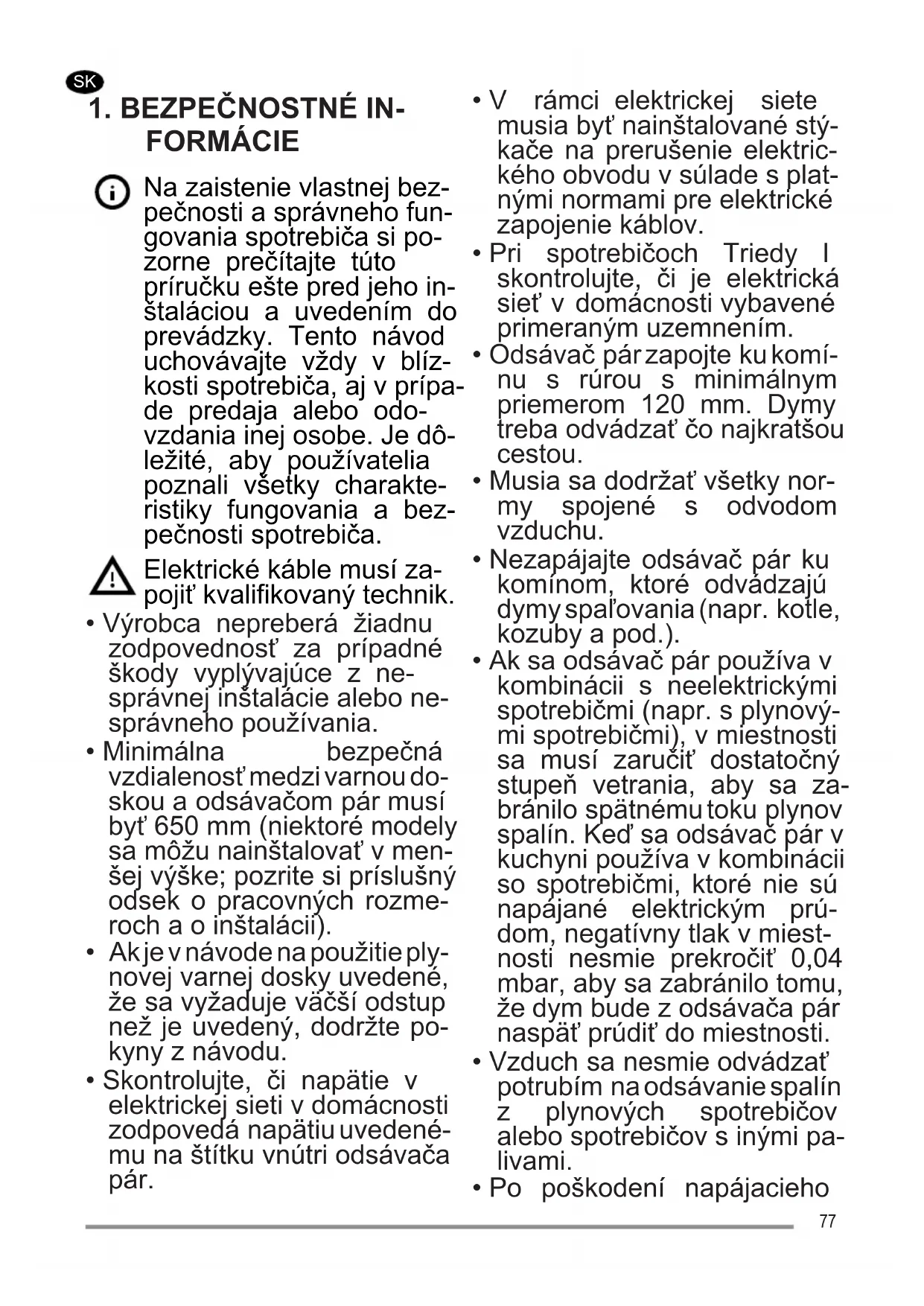 FORMÁCIE Na zaistenie vlastnej bez- pečnosti a správneho fun- govania spotrebiča si po- zorne prečítajte túto príručku ešte pred jeho in- štaláciou a uvedením do prevádzky. Tento návod uchovávajte vždy v blíz- kosti spotrebiča, aj vprípa- de predaja alebo odo- vzdania inej osobe. Je dô- ležité, aby používatelia poznali všetky charakte- ristiky fungovania a bez- pečnosti spotrebiča. Elektrické káble musí za- pojiť kvalifikovaný technik.
