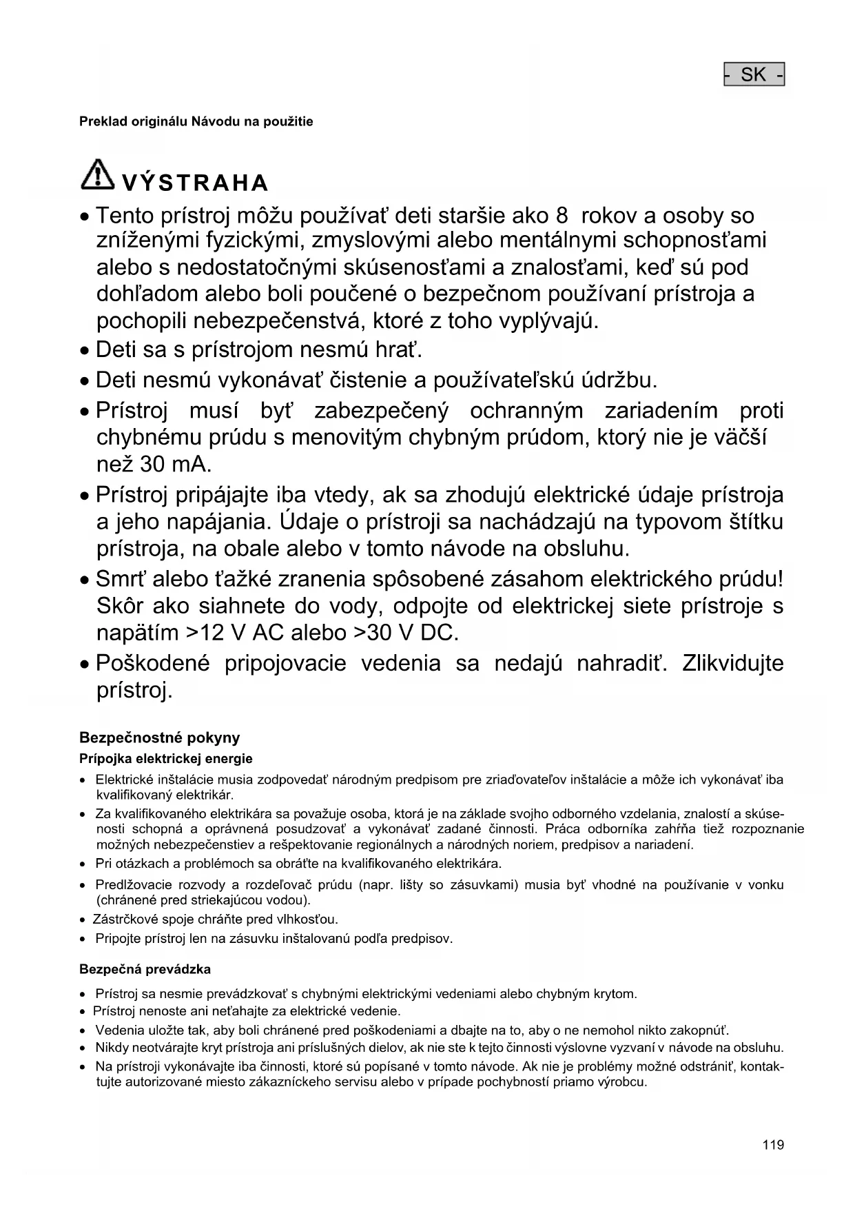 - Prístroj musí byť zabezpečený ochranným zariadením proti chybnému prúdu s menovitým chybným prúdom, ktorý nie je väčší než 30 mA.