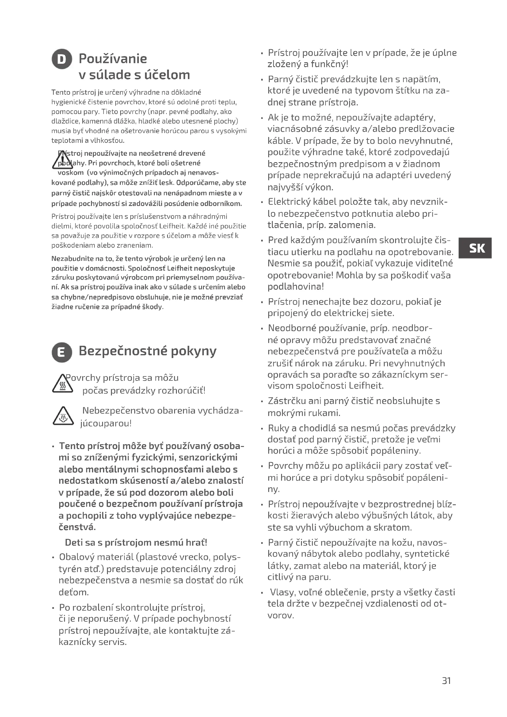Leifheit AG Leifheitstraße 1 56377 Nassau/Lahn Nemecko Ilustrácienájdetenastrane2-4.31 Tentoprístrojjeurčenývýhradnenadôkladné hygienickéčisteniepovrchov,ktorésúodolnéprotiteplu, pomocoupary.Tietopovrchy(napr.pevnépodlahy,ako dlaždice,kamennádlážka,hladkéaleboutesnenéplochy) musiabyťvhodnénaošetrovaniehorúcouparousvysokými teplotamiavlhkosťou. Prístroj nepoužívajte na neošetrené drevené podlahy. Pri povrchoch, ktoré boli ošetrené voskom (vo výnimočných prípadoch aj nenavos- kované podlahy), sa môže znížiť lesk. Odporúčame, aby ste parný čistič najskôr otestovali na nenápadnom mieste a v prípade pochybností si zadovážili posúdenie odborníkom. Prístrojpoužívajtelenspríslušenstvomanáhradnými dielmi,ktorépovolilaspoločnosťLeifheit.Každéinépoužitie sapovažujezapoužitievrozporesúčelomamôževiesťk poškodeniamalebozraneniam. Nezabudnite na to, že tento výrobok je určený len na použitie v domácnosti. Spoločnosť Leifheit neposkytuje záruku poskytovanú výrobcom pri priemyselnom používa- ní.Ak sa prístroj používa inak ako v súlade s určením alebo sa chybne/nepredpisovo obsluhuje, nie je možné prevziať žiadne ručenie za prípadné škody. Používanie v súlade s účelom
