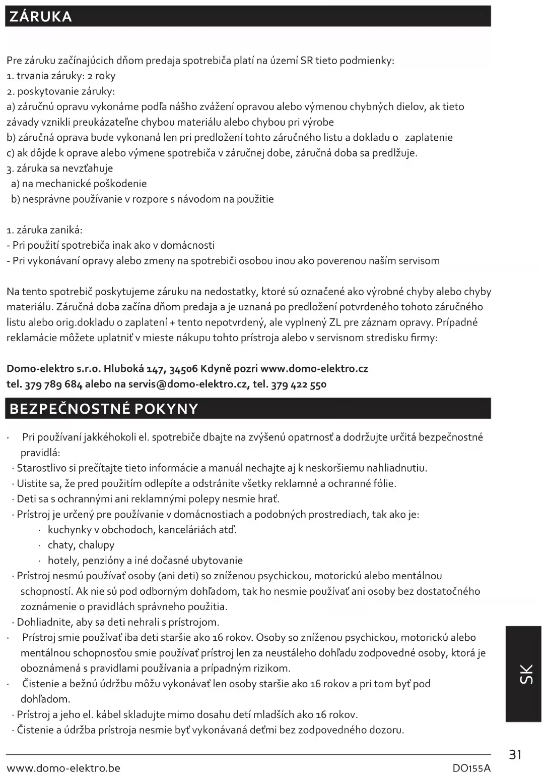 - Pri použití spotrebiča inak ako v domácnosti - Pri vykonávaní opravy alebo zmeny na spotrebiči osobou inou ako poverenou naším servisom Na tento spotrebič poskytujeme záruku na nedostatky, ktoré sú označené ako výrobné chyby alebo chyby materiálu. Záručná doba začína dňom predaja a je uznaná po predložení potvrdeného tohoto záručného listu alebo orig.dokladu o zaplatení + tento nepotvrdený, ale vyplnený ZL pre záznam opravy. Prípadné reklamácie môžete uplatniť v mieste nákupu tohto prístroja alebo v servisnom stredisku rmy: Domo-elektro s.r.o. Hluboká 147, 34506 Kdyně pozri www.domo-elektro.cz tel. 379 789 684 alebo na servis@domo-elektro.cz, tel. 379 422 550