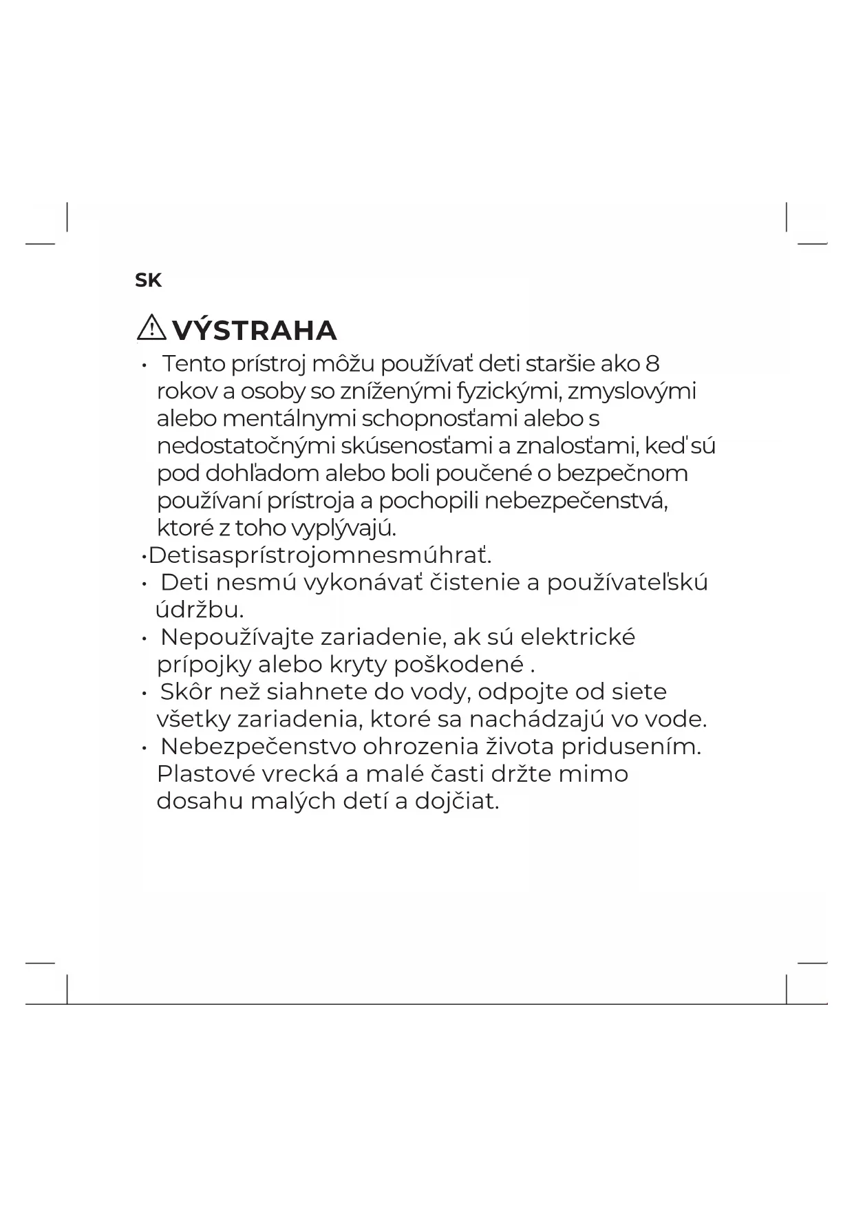 - Tento prístroj môžu používať deti staršie ako 8 rokov a osoby so zníženými fyzickými, zmyslovými alebo mentálnymi schopnosťami alebo s nedostatočnými skúsenosťami a znalosťami, keď sú pod dohľadom alebo boli poučené o bezpečnom používaní prístroja a pochopili nebezpečenstvá, ktoré z toho vyplývajú.