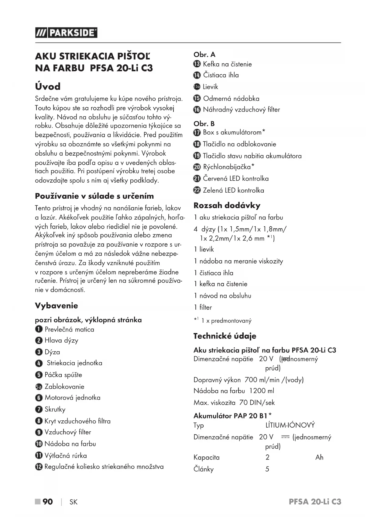 NA FARBU PFSA 20-Li C3 Úvod Srdečne vám gratulujeme kukúpe nového prístroja. Touto kúpou ste sa rozhodli pre výrobok vysokej kvality. Návod na obsluhu je súčasťou tohto vý- robku. Obsahuje dôležité upozornenia týkajúce sa bezpečnosti, používania a likvidácie. Pred použitím výrobku sa oboznámte sovšetkými pokynmi na obsluhu a bezpečnostnými pokynmi. Výrobok používajte iba podľa opisu a vuvedených oblas- tiach použitia. Pri postúpení výrobku tretej osobe odovzdajte spolu sním aj všetky podklady. Používanie vsúlade surčením Tento prístroj je vhodný na nanášanie farieb, lakov a lazúr. Akékoľvek použitie ľahko zápalných, horľa- vých farieb, lakov alebo riedidiel nie je povolené. Akýkoľvek iný spôsob používania alebo zmena prístroja sa považuje za používanie v rozpore sur- čeným účelom a má za následok vážne nebezpe- čenstvá úrazu. Za škody vzniknuté použitím v rozpore s určeným účelom nepreberáme žiadne ručenie. Prístroj je určený len na súkromné používa- nie v domácnosti. Vybavenie pozri obrázok, výklopná stránka Prevlečná matica Hlava dýzy Dýza Striekacia jednotka Páčka spúšte