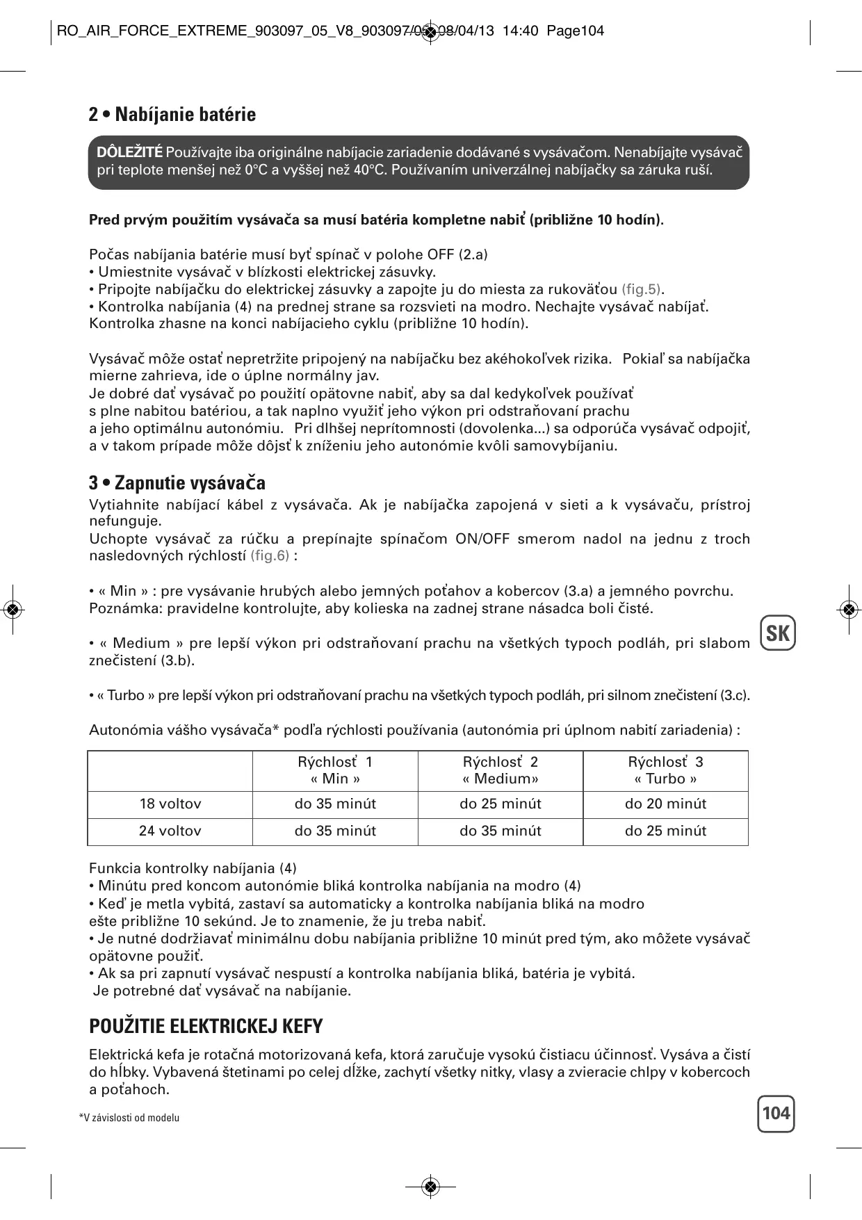 Retirez le cordon du chargeur, de l’aspirateur. Si le chargeur reste connecté à la prise secteur et à l'appareil, l'appareil ne fonctionne pas. Saisissez l’aspirateur par la poignée et faites coulisser l’interrupteur Marche/Arrêt vers le bas, sur l’une des trois vitesses suivantes (fig.6) : • « Min » : pour l’aspiration des tapis et moquettes épais ou délicats (3.a) et des surfaces fragiles. Remarque : vérifiez régulièrement que les roues situées à l’arrière du suceur soient propres. • « Medium » : pour une meilleure performance de dépoussiérage sur tous types de sols, en cas de faible salissure (3.b). • « Turbo » : pour la meilleure performance de dépoussiérage sur tous types de sols en cas de fort encrassement (3.c). Autonomie de votre aspirateur* selon la vitesse d’utilisation (autonomie lorsque l’appareil est complètement chargé) : Vitesse 1 « Min »