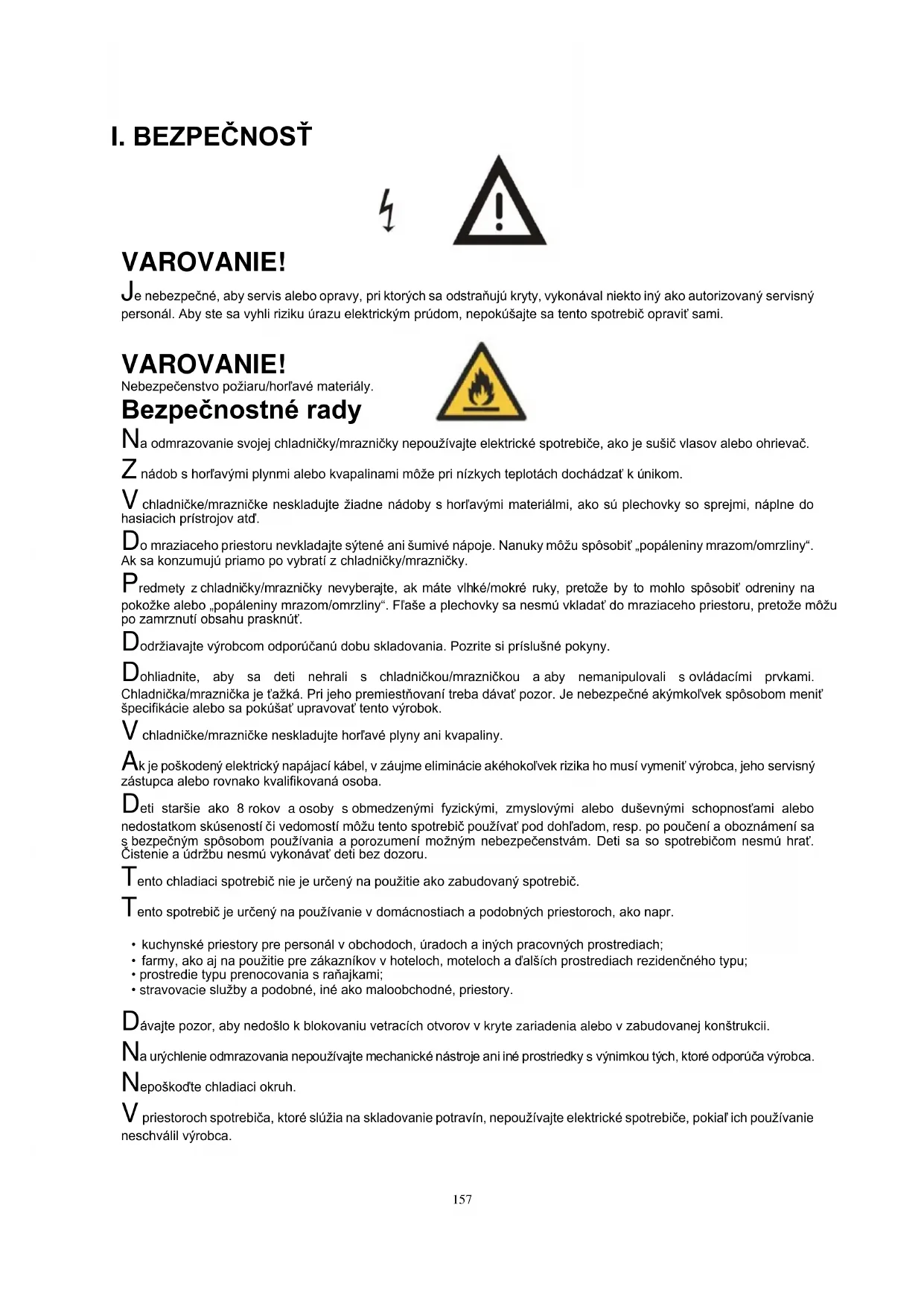 VAROVANIE! Je nebezpečné, aby servis alebo opravy, pri ktorých sa odstraňujú kryty, vykonával niekto iný ako autorizovaný servisný personál. Aby ste sa vyhli riziku úrazu elektrickým prúdom, nepokúšajte sa tento spotrebič opraviť sami. VAROVANIE! Nebezpečenstvo požiaru/horľavé materiály. Bezpečnostné rady Na odmrazovanie svojej chladničky/mrazničky nepoužívajte elektrické spotrebiče, ako je sušič vlasov alebo ohrievač. Z nádob s horľavými plynmi alebo kvapalinami môže pri nízkych teplotách dochádzať k únikom. V chladničke/mrazničke neskladujte žiadne nádoby s horľavými materiálmi, ako sú plechovky so sprejmi, náplne do hasiacich prístrojov atď. Do mraziaceho priestoru nevkladajte sýtené ani šumivé nápoje. Nanuky môžu spôsobiť „popáleniny mrazom/omrzliny“. Ak sa konzumujú priamo po vybratí z chladničky/mrazničky. Predmety z chladničky/mrazničky nevyberajte, ak máte vlhké/mokré ruky, pretože by to mohlo spôsobiť odreniny na pokožke alebo „popáleniny mrazom/omrzliny“. Fľaše a plechovky sa nesmú vkladať do mraziaceho priestoru, pretože môžu po zamrznutí obsahu prasknúť. Dodržiavajte výrobcom odporúčanú dobu skladovania. Pozrite si príslušné pokyny. Dohliadnite, aby sa deti nehrali s chladničkou/mrazničkou a aby nemanipulovali s ovládacími prvkami. Chladnička/mraznička je ťažká. Pri jeho premiestňovaní treba dávať pozor. Je nebezpečné akýmkoľvek spôsobom meniť špecifikácie alebo sa pokúšať upravovať tento výrobok. V chladničke/mrazničke neskladujte horľavé plyny ani kvapaliny. Ak je poškodený elektrický napájací kábel, v záujme eliminácie akéhokoľvek rizika ho musí vymeniť výrobca, jeho servisný zástupca alebo rovnako kvalifikovaná osoba. Deti staršie ako 8 rokov a osoby s obmedzenými fyzickými, zmyslovými alebo duševnými schopnosťami alebo nedostatkom skúseností či vedomostí môžu tento spotrebič používať pod dohľadom, resp. po poučení a oboznámení sa s bezpečným spôsobom používania a porozumení možným nebezpečenstvám. Deti sa so spotrebičom nesmú hrať. Čistenie a údržbu nesmú vykonávať deti bez dozoru. Tento chladiaci spotrebič nie je určený na použitie ako zabudovaný spotrebič. Tento spotrebič je určený na používanie v domácnostiach a podobných priestoroch, ako napr.
