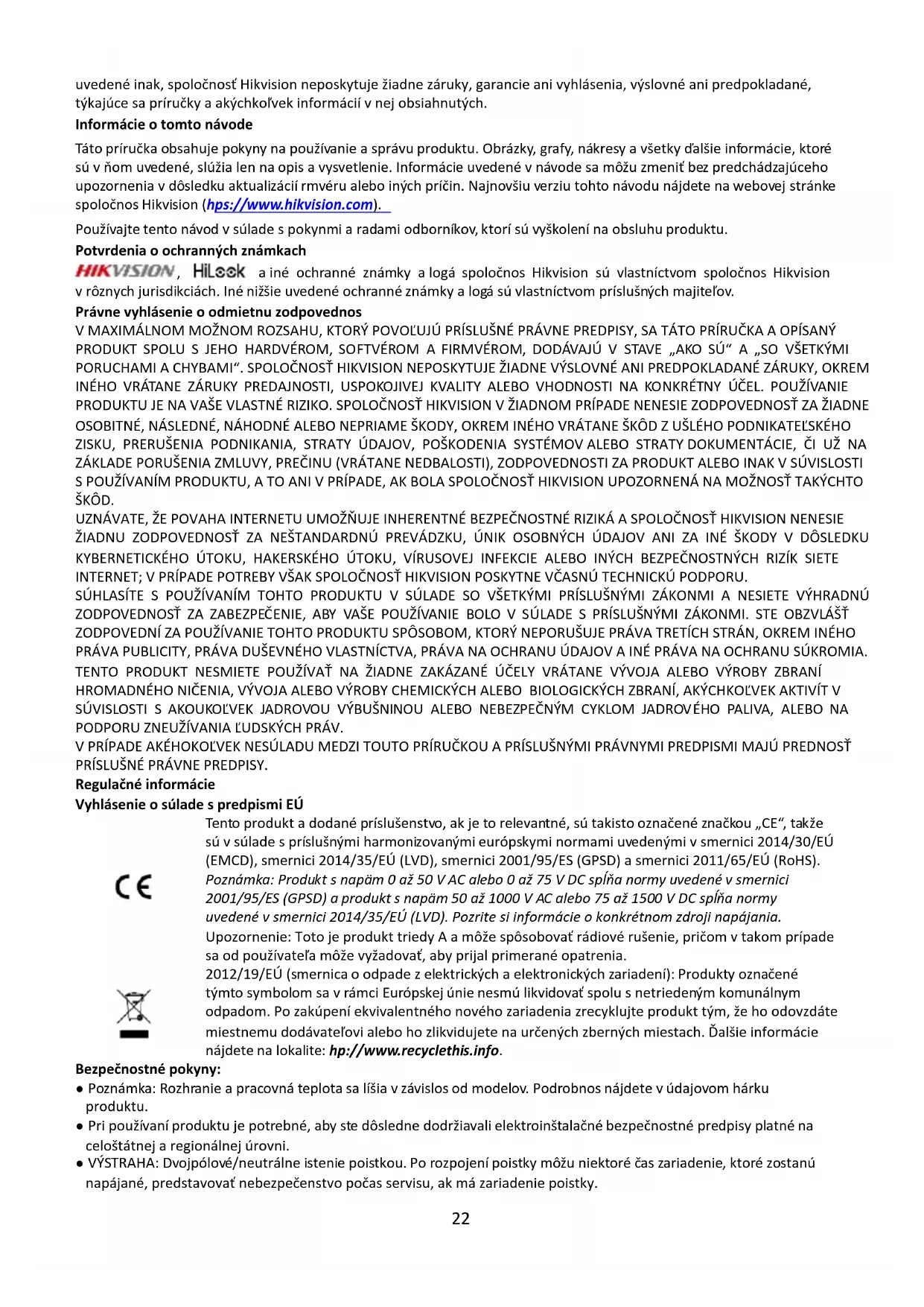 uvedené inak, spoločnosť Hikvision neposkytuje žiadne záruky, garancie ani vyhlásenia, výslovné ani predpokladané, týkajúce sa príručky a akýchkoľvek informácií v nej obsiahnutých. Informácie o tomto návode Táto príručka obsahuje pokyny na používanie a správu produktu. Obrázky, grafy, nákresy a všetky ďalšie informácie, ktoré sú v ňom uvedené, slúžia len na opis a vysvetlenie. Informácie uvedené v návode sa môžu zmeniť bez predchádzajúceho upozornenia v dôsledku aktualizácií firmvéru alebo iných príčin. Najnovšiu verziu tohto návodu nájdete na webovej stránke spoločnosti Hikvision (https://www.hikvision.com). Používajte tento návod v súlade s pokynmi a radami odborníkov, ktorí sú vyškolení na obsluhu produktu. Potvrdenia o ochranných známkach , a iné ochranné známky a logá spoločnosti Hikvision sú vlastníctvom spoločnosti Hikvision v rôznych jurisdikciách. Iné nižšie uvedené ochranné známky a logá sú vlastníctvom príslušných majiteľov. Právne vyhlásenie o odmietnutí zodpovednosti V MAXIMÁLNOM MOŽNOM ROZSAHU, KTORÝ POVOĽUJÚ PRÍSLUŠNÉ PRÁVNE PREDPISY, SA TÁTO PRÍRUČKA A OPÍSANÝ PRODUKT SPOLU S JEHO HARDVÉROM, SOFTVÉROM A FIRMVÉROM, DODÁVAJÚ V STAVE „AKO SÚ“ A „SO VŠETKÝMI PORUCHAMI A CHYBAMI“. SPOLOČNOSŤ HIKVISION NEPOSKYTUJE ŽIADNE VÝSLOVNÉ ANI PREDPOKLADANÉ ZÁRUKY, OKREM INÉHO VRÁTANE ZÁRUKY PREDAJNOSTI, USPOKOJIVEJ KVALITY ALEBO VHODNOSTI NA KONKRÉTNY ÚČEL. POUŽÍVANIE PRODUKTU JE NA VAŠE VLASTNÉ RIZIKO. SPOLOČNOSŤ HIKVISION V ŽIADNOM PRÍPADE NENESIE ZODPOVEDNOSŤ ZA ŽIADNE OSOBITNÉ, NÁSLEDNÉ, NÁHODNÉ ALEBO NEPRIAME ŠKODY, OKREM INÉHO VRÁTANE ŠKÔD Z UŠLÉHO PODNIKATEĽSKÉHO ZISKU, PRERUŠENIA PODNIKANIA, STRATY ÚDAJOV, POŠKODENIA SYSTÉMOV ALEBO STRATY DOKUMENTÁCIE, ČI UŽ NA ZÁKLADE PORUŠENIA ZMLUVY, PREČINU (VRÁTANE NEDBALOSTI), ZODPOVEDNOSTI ZA PRODUKT ALEBO INAK V SÚVISLOSTI S POUŽÍVANÍM PRODUKTU, A TO ANI V PRÍPADE, AK BOLA SPOLOČNOSŤ HIKVISION UPOZORNENÁ NA MOŽNOSŤ TAKÝCHTO ŠKÔD. UZNÁVATE, ŽE POVAHA INTERNETU UMOŽŇUJE INHERENTNÉ BEZPEČNOSTNÉ RIZIKÁ A SPOLOČNOSŤ HIKVISION NENESIE ŽIADNU ZODPOVEDNOSŤ ZA NEŠTANDARDNÚ PREVÁDZKU, ÚNIK OSOBNÝCH ÚDAJOV ANI ZA INÉ ŠKODY V DÔSLEDKU KYBERNETICKÉHO ÚTOKU, HAKERSKÉHO ÚTOKU, VÍRUSOVEJ INFEKCIE ALEBO INÝCH BEZPEČNOSTNÝCH RIZÍK SIETE INTERNET; V PRÍPADE POTREBY VŠAK SPOLOČNOSŤ HIKVISION POSKYTNE VČASNÚ TECHNICKÚ PODPORU. SÚHLASÍTE S POUŽÍVANÍM TOHTO PRODUKTU V SÚLADE SO VŠETKÝMI PRÍSLUŠNÝMI ZÁKONMI A NESIETE VÝHRADNÚ ZODPOVEDNOSŤ ZA ZABEZPEČENIE, ABY VAŠE POUŽÍVANIE BOLO V SÚLADE S PRÍSLUŠNÝMI ZÁKONMI. STE OBZVLÁŠŤ ZODPOVEDNÍ ZA POUŽÍVANIE TOHTO PRODUKTU SPÔSOBOM, KTORÝ NEPORUŠUJE PRÁVA TRETÍCH STRÁN, OKREM INÉHO PRÁVA PUBLICITY, PRÁVA DUŠEVNÉHO VLASTNÍCTVA, PRÁVA NA OCHRANU ÚDAJOV A INÉ PRÁVA NA OCHRANU SÚKROMIA. TENTO PRODUKT NESMIETE POUŽÍVAŤ NA ŽIADNE ZAKÁZANÉ ÚČELY VRÁTANE VÝVOJA ALEBO VÝROBY ZBRANÍ HROMADNÉHO NIČENIA, VÝVOJA ALEBO VÝROBY CHEMICKÝCH ALEBO BIOLOGICKÝCH ZBRANÍ, AKÝCHKOĽVEK AKTIVÍT V SÚVISLOSTI S AKOUKOĽVEK JADROVOU VÝBUŠNINOU ALEBO NEBEZPEČNÝM CYKLOM JADROVÉHO PALIVA, ALEBO NA PODPORU ZNEUŽÍVANIA ĽUDSKÝCH PRÁV. V PRÍPADE AKÉHOKOĽVEK NESÚLADU MEDZI TOUTO PRÍRUČKOU A PRÍSLUŠNÝMI PRÁVNYMI PREDPISMI MAJÚ PREDNOSŤ PRÍSLUŠNÉ PRÁVNE PREDPISY. Regulačné informácie Vyhlásenie o súlade s predpismi EÚ