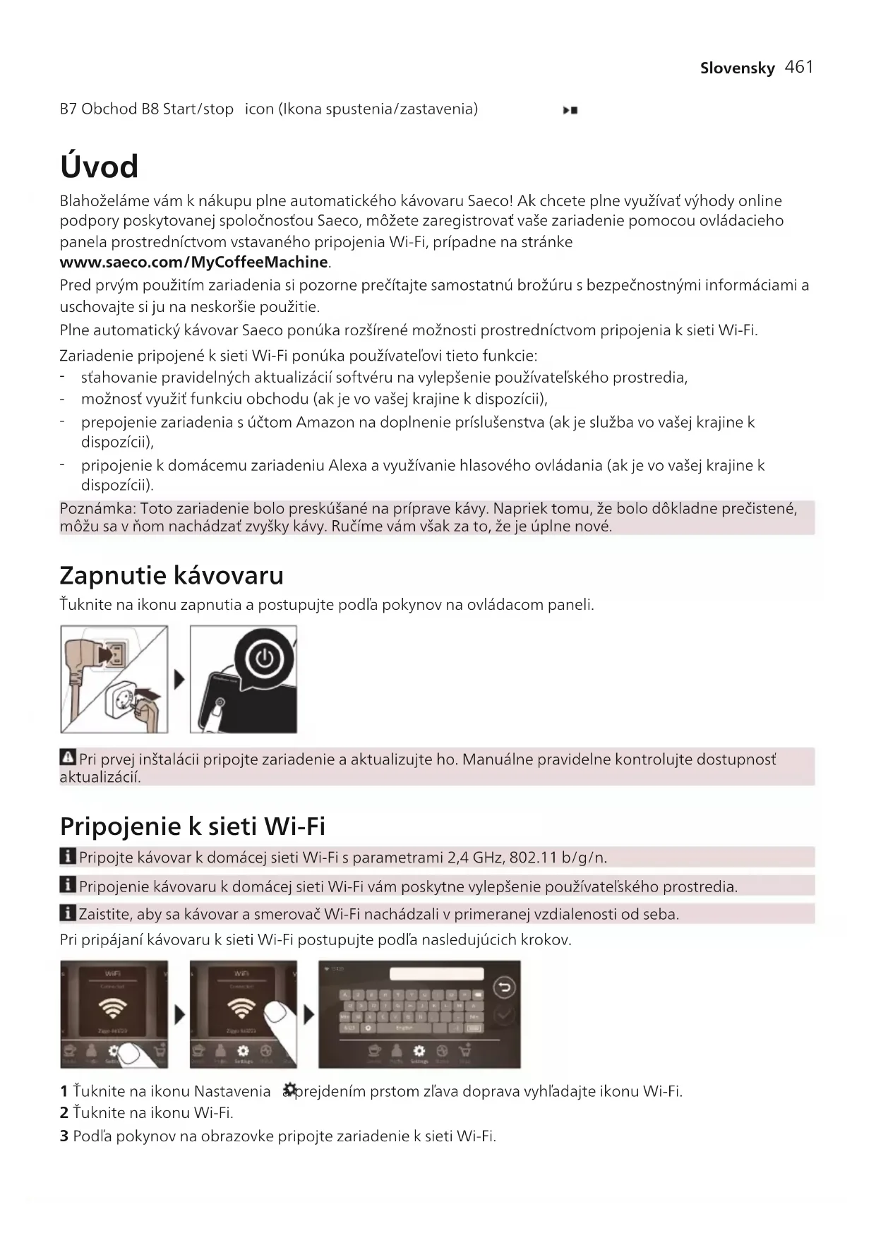 Slovensky Obsah Prehľad zariadenia (obr. A) _________________________________________________________________ 460 Úvod ____________________________________________________________________________________ 461 Úprava nastavení zariadenia________________________________________________________________ 465 Vodný filter AquaClean ____________________________________________________________________ 466 Vyberanie a vkladanie varnej zostavy ________________________________________________________ 467 Čistenie aúdržba _________________________________________________________________________ 468 Proces odstraňovania vodného kameňa______________________________________________________ 471 Chybové kódy ____________________________________________________________________________ 472 Objednávanie príslušenstva ________________________________________________________________ 473 Aktualizácie softvéru ______________________________________________________________________ 473 Riešenie problémov _______________________________________________________________________ 474 Technické parametre ______________________________________________________________________ 479 Vyhlásenie o zhode________________________________________________________________________ 480 Wi-Fi ____________________________________________________________________________________ 480 Prehľad zariadenia (obr. A) A1 Veko násypky na kávové zrná A2 Veko priehradky na mletú kávu A3 Ovládací panel A4 Zásuvka na kábel A5 Podnos na odkvapkávanie A6 Rukoväť na uvoľnenie podnosu na odkvapkávanie A7 Nádoba HygieSteam A8 Kryt HygieSteam s držiakom na trubičku na mlieko A9 Výškovo nastaviteľný výpust na dávkovanie kávy amlieka A10 Vnútorný speňovač mlieka A11 Napájací kábel so zástrčkou A12 Ovládač nastavenia mletia (ďalšie informácie nájdete na adrese www.saeco.com/care) A13 Násypka na kávové zrná A14 Varná zostava (ďalšie informácie nájdete na adrese www.saeco.com/care) A15 Servisné dvierka A16 Zásobník na vodu A17 Zásobník na pomletú kávu A18 Predný panel zásobníka na pomletú kávu A19 Kryt podnosu na odkvapkávanie A20 Indikátor „Plný podnos na odkvapkávanie“ Príslušenstvo A21 Zásobník na mlieko A22 Trubica na mlieko A23 Čistiaca kefka A24 Tuba s mazivom A25 Filter AquaClean A26 Odmerka A27 Prúžok na testovanie tvrdosti vody Ovládací panel Prehľad všetkých ikon nájdete na obrázku B. Ďalej sa uvádzajú popisy. B1 On/off icon (Ikona zapnutia/vypnutia) B2 Drinks (Nápoje) B3 Drinks menu (Ponuka nápojov) B4 Personal profiles (Osobné profily) B5 Machine settings (Nastavenia zariadenia) B6 Status menu (Stavová ponuka)461 Slovensky B7 Obchod B8 Start/stop icon (Ikona spustenia/zastavenia) Úvod Blahoželáme vám k nákupu plne automatického kávovaru Saeco! Ak chcete plne využívať výhody online podpory poskytovanej spoločnosťou Saeco, môžete zaregistrovať vaše zariadenie pomocou ovládacieho panela prostredníctvom vstavaného pripojenia Wi-Fi, prípadne na stránke www.saeco.com/MyCoffeeMachine. Pred prvým použitím zariadenia si pozorne prečítajte samostatnú brožúru s bezpečnostnými informáciami a uschovajte si ju na neskoršie použitie. Plne automatický kávovar Saeco ponúka rozšírené možnosti prostredníctvom pripojenia k sieti Wi-Fi. Zariadenie pripojené k sieti Wi-Fi ponúka používateľovi tieto funkcie: