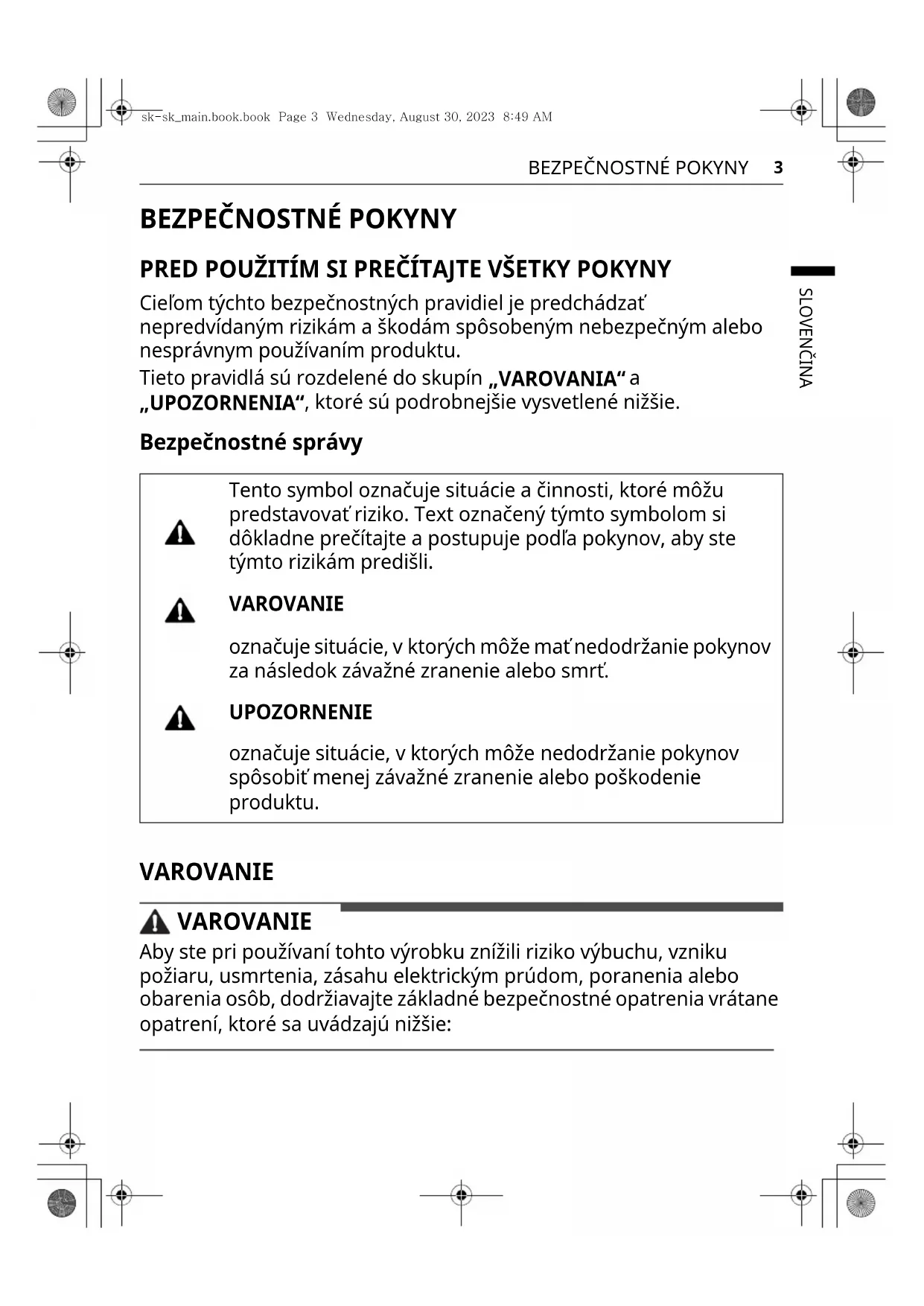 „UPOZORNENIA“ , ktoré sú podrobnejšie vysvetlené nižšie. Bezpečnostné správy VAROVANIE VAROVANIE Aby ste pri používaní tohto výrobku znížili riziko výbuchu, vzniku požiaru, usmrtenia, zásahu elektrickým prúdom, poranenia alebo obarenia osôb, dodržiavajte základné bezpečnostné opatrenia vrátane opatrení, ktoré sa uvádzajú nižšie: Tento symbol označuje situácie a činnosti, ktoré môžu predstavovať riziko. Text označený týmto symbolom si dôkladne prečítajte a postupuje podľa pokynov, aby ste týmto rizikám predišli. VAROVANIE označuje situácie, v ktorých môže mať nedodržanie pokynov za následok závažné zranenie alebo smrť. UPOZORNENIE označuje situácie, v ktorých môže nedodržanie pokynov spôsobiť menej závažné zranenie alebo poškodenie produktu. sk-sk_main.book.book Page 3 Wednesday, August 30, 2023 8:49 AM4
