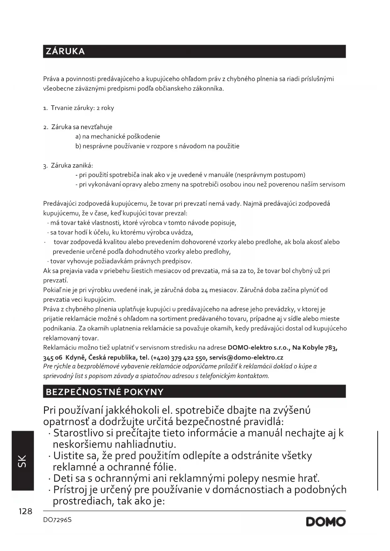 - tovar vyhovuje požiadavkám právnych predpisov. Ak sa prejavia vada v priebehu šiestich mesiacov od prevzatia, má sa za to, že tovar bol chybný už pri prevzatí. Pokiaľ nie je pri výrobku uvedené inak, je záručná doba 24 mesiacov. Záručná doba začína plynúť od prevzatia veci kupujúcim. Práva z chybného plnenia uplatňuje kupujúci u predávajúceho na adrese jeho prevádzky, v ktorej je prijatie reklamácie možné s ohľadom na sortiment predávaného tovaru, prípadne aj v sídle alebo mieste podnikania. Za okamih uplatnenia reklamácie sa považuje okamih, kedy predávajúci dostal od kupujúceho reklamovaný tovar. Reklamáciu možno tiež uplatniť v servisnom stredisku na adrese DOMO-elektro s.r.o., Na Kobyle 783, 345 06 Kdyně, Česká republika, tel. (+420) 379 422 550, servis@domo-elektro.cz Pre rýchle a bezproblémové vybavenie reklamácie odporúčame priložiť k reklamácii doklad o kúpe a sprievodný list s popisom závady a spiatočnou adresou s telefonickým kontaktom.