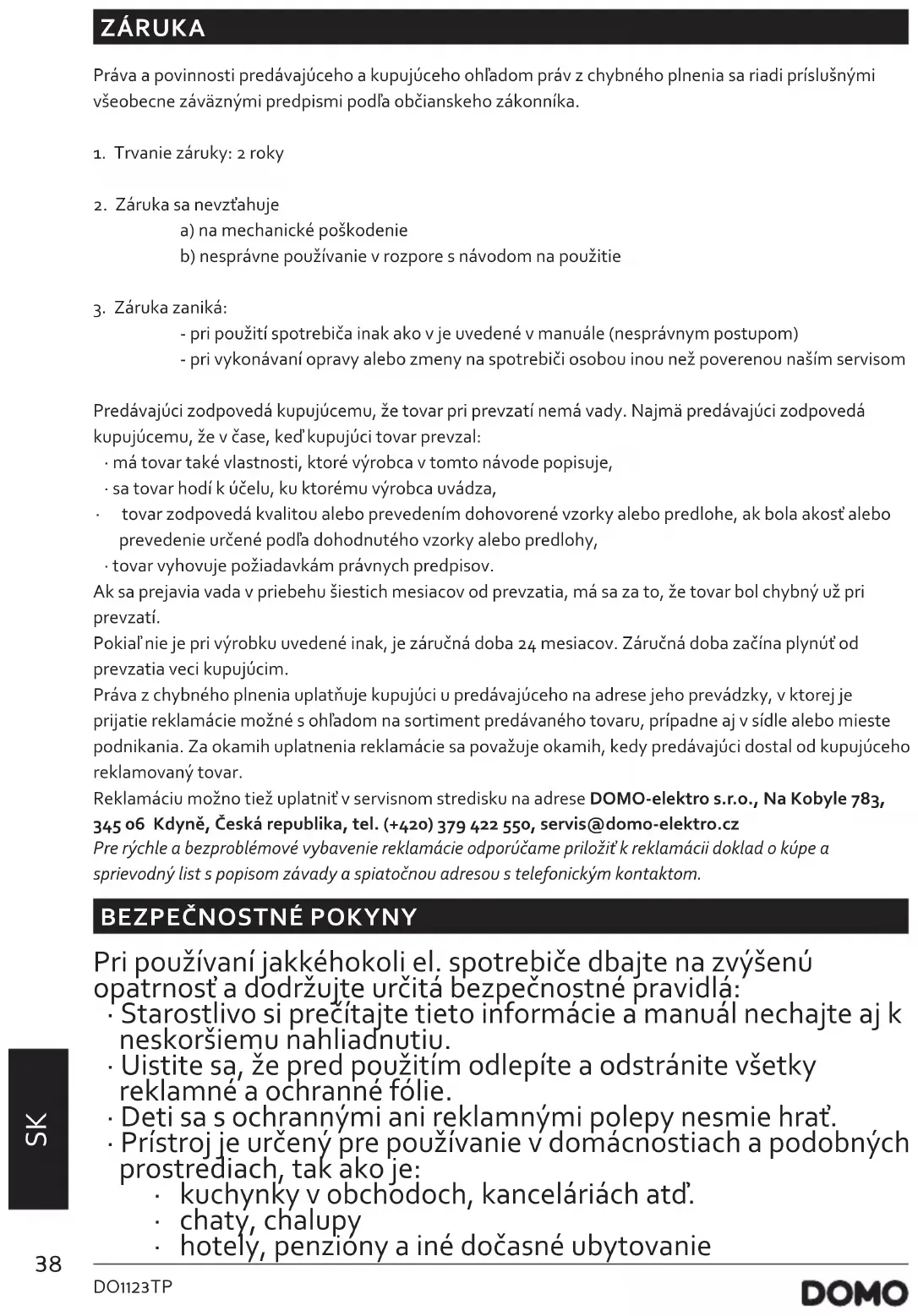 - tovar vyhovuje požiadavkám právnych predpisov. Ak sa prejavia vada v priebehu šiestich mesiacov od prevzatia, má sa za to, že tovar bol chybný už pri prevzatí. Pokiaľ nie je pri výrobku uvedené inak, je záručná doba 24 mesiacov. Záručná doba začína plynúť od prevzatia veci kupujúcim. Práva z chybného plnenia uplatňuje kupujúci u predávajúceho na adrese jeho prevádzky, v ktorej je prijatie reklamácie možné s ohľadom na sortiment predávaného tovaru, prípadne aj v sídle alebo mieste podnikania. Za okamih uplatnenia reklamácie sa považuje okamih, kedy predávajúci dostal od kupujúceho reklamovaný tovar. Reklamáciu možno tiež uplatniť v servisnom stredisku na adrese DOMO-elektro s.r.o., Na Kobyle 783, 345 06 Kdyně, Česká republika, tel. (+420) 379 422 550, servis@domo-elektro.cz Pre rýchle a bezproblémové vybavenie reklamácie odporúčame priložiť k reklamácii doklad o kúpe a sprievodný list s popisom závady a spiatočnou adresou s telefonickým kontaktom.