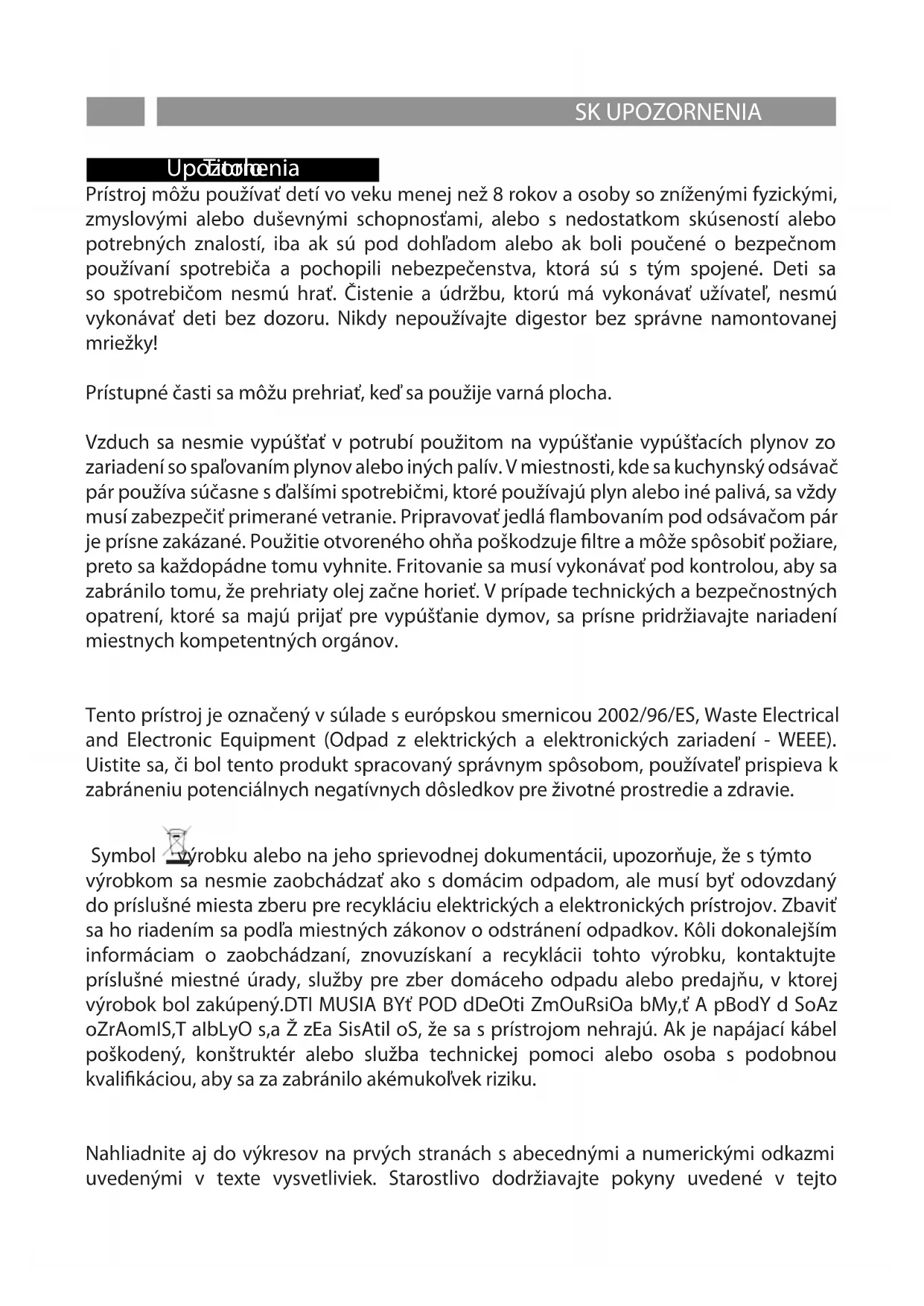Upozornenia UPOZORNENIASK UPOZORNENIA Prístroj môžu používať detí vo veku menej než 8 rokov a osoby so zníženými fyzickými, zmyslovými alebo duševnými schopnosťami, alebo s nedostatkom skúseností alebo potrebných znalostí, iba ak sú pod dohľadom alebo ak boli poučené o bezpečnom používaní spotrebiča a pochopili nebezpečenstva, ktorá sú s tým spojené. Deti sa so spotrebičom nesmú hrať. Čistenie a údržbu, ktorú má vykonávať užívateľ, nesmú vykonávať deti bez dozoru. Nikdy nepoužívajte digestor bez správne namontovanej mriežky! Prístupné časti sa môžu prehriať, keď sa použije varná plocha. Vzduch sa nesmie vypúšťať v potrubí použitom na vypúšťanie vypúšťacích plynov zo zariadení so spaľovaním plynov alebo iných palív. V miestnosti, kde sa kuchynský odsávač pár používa súčasne s ďalšími spotrebičmi, ktoré používajú plyn alebo iné palivá, sa vždy musí zabezpečiť primerané vetranie. Pripravovať jedlá ambovaním pod odsávačom pár je prísne zakázané. Použitie otvoreného ohňa poškodzuje ltre a môže spôsobiť požiare, preto sa každopádne tomu vyhnite. Fritovanie sa musí vykonávať pod kontrolou, aby sa zabránilo tomu, že prehriaty olej začne horieť. V prípade technických a bezpečnostných opatrení, ktoré sa majú prijať pre vypúšťanie dymov, sa prísne pridržiavajte nariadení miestnych kompetentných orgánov. Tento prístroj je označený v súlade s európskou smernicou 2002/96/ES, Waste Electrical and Electronic Equipment (Odpad z elektrických a elektronických zariadení - WEEE). Uistite sa, či bol tento produkt spracovaný správnym spôsobom, používateľ prispieva k zabráneniu potenciálnych negatívnych dôsledkov pre životné prostredie a zdravie. Symbol výrobku alebo na jeho sprievodnej dokumentácii, upozorňuje, že s týmto výrobkom sa nesmie zaobchádzať ako s domácim odpadom, ale musí byť odovzdaný do príslušné miesta zberu pre recykláciu elektrických a elektronických prístrojov. Zbaviť sa ho riadením sa podľa miestných zákonov o odstránení odpadkov. Kôli dokonalejším informáciam o zaobchádzaní, znovuzískaní a recyklácii tohto výrobku, kontaktujte príslušné miestné úrady, služby pre zber domáceho odpadu alebo predajňu, v ktorej výrobok bol zakúpený.DTI MUSIA BYť POD dDeOti ZmOuRsiOa bMy,ť A pBodY d SoAz oZrAomIS,T aIbLyO s,a Ž zEa SisAtil oS, že sa s prístrojom nehrajú. Ak je napájací kábel poškodený, konštruktér alebo služba technickej pomoci alebo osoba s podobnou kvalikáciou, aby sa za zabránilo akémukoľvek riziku. Nahliadnite aj do výkresov na prvých stranách s abecednými a numerickými odkazmi uvedenými v texte vysvetliviek. Starostlivo dodržiavajte pokyny uvedené v tejtoFUNZIONAMENTO