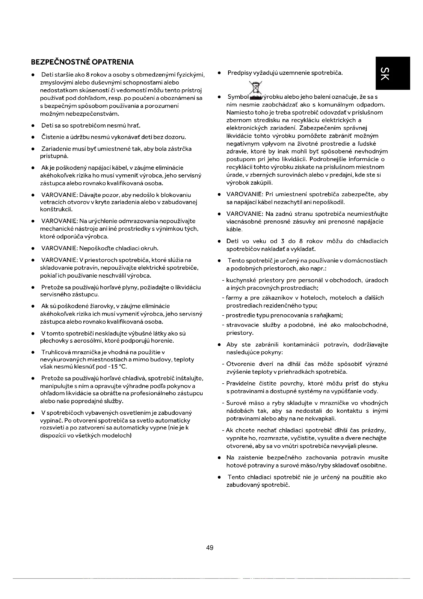 ● Deti staršie ako 8 rokov a osoby s obmedzenými fyzickými, zmyslovými alebo duševnými schopnosťami alebo nedostatkom skúseností či vedomostí môžu tento prístroj používať pod dohľadom, resp. po poučení a oboznámení sa s bezpečným spôsobom používania a porozumení možným nebezpečenstvám. ● Deti sa so spotrebičom nesmú hrať. ● Čistenie a údržbu nesmú vykonávať deti bez dozoru. ● Zariadenie musí byť umiestnené tak, aby bola zástrčka prístupná. ● Ak je poškodený napájací kábel, v záujme eliminácie akéhokoľvek rizika ho musí vymeniť výrobca, jeho servisný zástupca alebo rovnako kvalifikovaná osoba. ● VAROVANIE: Dávajte pozor, aby nedošlo k blokovaniu vetracích otvorov v kryte zariadenia alebo v zabudovanej konštrukcii. ● VAROVANIE: Na urýchlenie odmrazovania nepoužívajte mechanické nástroje ani iné prostriedky s výnimkou tých, ktoré odporúča výrobca. ● VAROVANIE: Nepoškoďte chladiaci okruh. ● VAROVANIE: V priestoroch spotrebiča, ktoré slúžia na skladovanie potravín, nepoužívajte elektrické spotrebiče, pokiaľ ich používanie neschválil výrobca. ● Pretože sa používajú horľavé plyny, požiadajte o likvidáciu servisného zástupcu. ● Ak sú poškodené žiarovky, v záujme eliminácie akéhokoľvek rizika ich musí vymeniť výrobca, jeho servisný zástupca alebo rovnako kvalifikovaná osoba. ● V tomto spotrebiči neskladujte výbušné látky ako sú plechovky s aerosólmi, ktoré podporujú horenie. ● Truhlicová mraznička je vhodná na použitie v nevykurovaných miestnostiach a mimo budovy, teploty však nesmú klesnúť pod -15 °C. ● Pretože sa používajú horľavé chladivá, spotrebič inštalujte, manipulujte s ním a opravujte výhradne podľa pokynov a ohľadom likvidácie sa obráťte na profesionálneho zástupcu alebo naše popredajné služby. ● V spotrebičoch vybavených osvetlením je zabudovaný vypínač. Po otvorení spotrebiča sa svetlo automaticky rozsvieti a po zatvorení sa automaticky vypne (nie je k dispozícii vo všetkých modeloch) ● Predpisy vyžadujú uzemnenie spotrebiča. ● Symbol na výrobku alebo jeho balení označuje, že sa s ním nesmie zaobchádzať ako s komunálnym odpadom. Namiesto toho je treba spotrebič odovzdať v príslušnom zbernom stredisku na recykláciu elektrických a elektronických zariadení. Zabezpečením správnej likvidácie tohto výrobku pomôžete zabrániť možným negatívnym vplyvom na životné prostredie a ľudské zdravie, ktoré by inak mohli byť spôsobené nevhodným postupom pri jeho likvidácii. Podrobnejšie informácie o recyklácii tohto výrobku získate na príslušnom miestnom úrade, v zberných surovinách alebo v predajni, kde ste si výrobok zakúpili. ● VAROVANIE: Pri umiestnení spotrebiča zabezpečte, aby sa napájací kábel nezachytil ani nepoškodil. ● VAROVANIE: Na zadnú stranu spotrebiča neumiestňujte viacnásobné prenosné zásuvky ani prenosné napájacie káble. ● Deti vo veku od 3 do 8 rokov môžu do chladiacich spotrebičov nakladať a vykladať. ● Tento spotrebič je určený na používanie v domácnostiach a podobných priestoroch, ako napr.: - kuchynské priestory pre personál v obchodoch, úradoch a iných pracovných prostrediach; - farmy a pre zákazníkov v hoteloch, moteloch a ďalších prostrediach rezidenčného typu; - prostredie typu prenocovania s raňajkami; - stravovacie služby a podobné, iné ako maloobchodné, priestory. ● Aby ste zabránili kontaminácii potravín, dodržiavajte nasledujúce pokyny: - Otvorenie dverí na dlhší čas môže spôsobiť výrazné zvýšenie teploty v priehradkách spotrebiča. - Pravidelne čistite povrchy, ktoré môžu prísť do styku s potravinami a dostupné systémy na vypúšťanie vody. - Surové mäso a ryby skladujte v mrazničke vo vhodných nádobách tak, aby sa nedostali do kontaktu s inými potravinami alebo aby na ne nekvapkali. - Ak chcete nechať chladiaci spotrebič dlhší čas prázdny, vypnite ho, rozmrazte, vyčistite, vysušte a dvere nechajte otvorené, aby sa vo vnútri spotrebiča nevyvíjali plesne. ● Na zaistenie bezpečného zachovania potravín musíte hotové potraviny a surové mäso/ryby skladovať osobitne. ● Tento chladiaci spotrebič nie je určený na použitie ako zabudovaný spotrebič. SK50 DIAGRAMY OBR1. A Veko B Tesnenie C Vnútorné svetlo (ak je k dispozícii) D Skriňa E Úložný priestor F Vetracia mriežka G Ovládací panel H Kôš I Komora kompresora J Kompresor K Ventilátor (ak je k dispozícii) L Zadný kondenzátor (ak je k dispozícii) M Odtoková zátka rozmrazenej vody