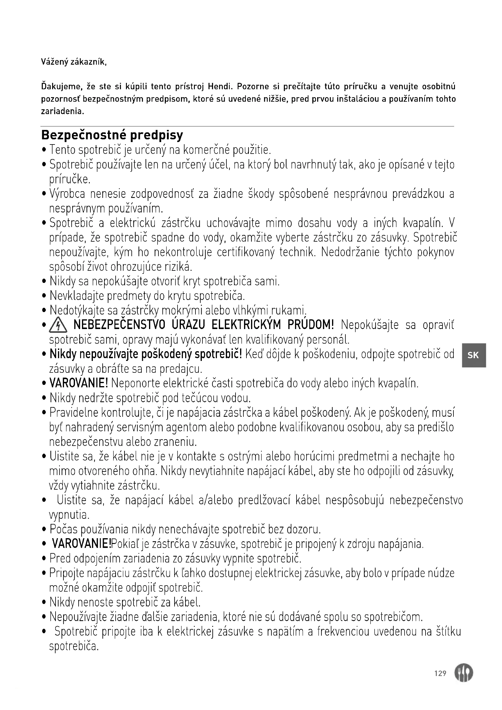Vážený zákazník, Ďakujeme, že ste si kúpili tento prístroj Hendi. Pozorne si prečítajte túto príručku a venujte osobitnú pozornosť bezpečnostným predpisom, ktoré sú uvedené nižšie, pred prvou inštaláciou a používaním tohto zariadenia. Bezpečnostné predpisy