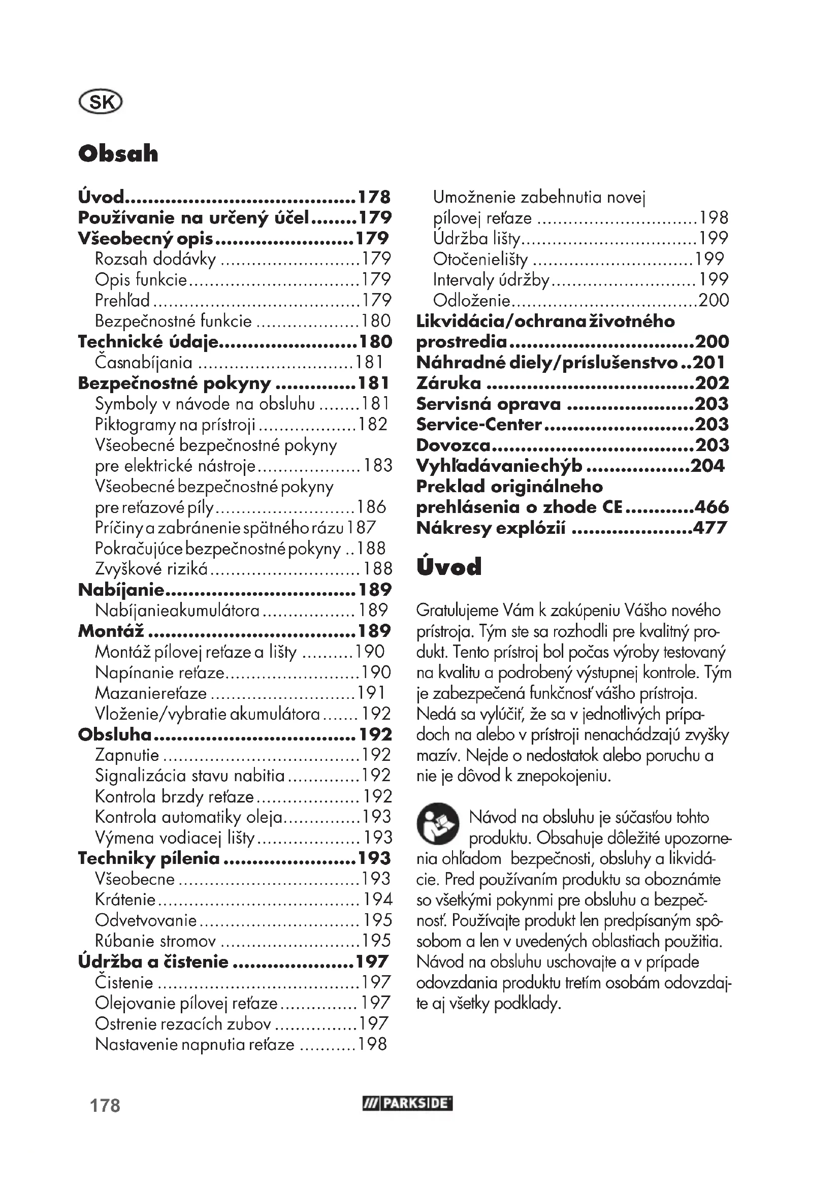 - Nákresy explózií Úvod Gratulujeme Vám k zakúpeniu Vášho nového prístroja. Tým ste sa rozhodli pre kvalitný pro- dukt. Tento prístroj bol počas výroby testovaný na kvalitu a podrobený výstupnej kontrole. Tým je zabezpečená funkčnosť vášho prístroja. Nedá sa vylúčiť, že sa v jednotlivých prípa- doch na alebo v prístroji nenachádzajú zvyšky mazív. Nejde o nedostatok alebo poruchu a nie je dôvod k znepokojeniu. Návod na obsluhu je súčasťou tohto produktu. Obsahuje dôležité upozorne- nia ohľadom bezpečnosti, obsluhy a likvidá- cie. Pred používaním produktu sa oboznámte so všetkými pokynmi pre obsluhu a bezpeč- nosť. Používajte produkt len predpísaným spô- sobom a len v uvedených oblastiach použitia. Návod na obsluhu uschovajte a v prípade odovzdania produktu tretím osobám odovzdaj- te aj všetky podklady.179 p. 477