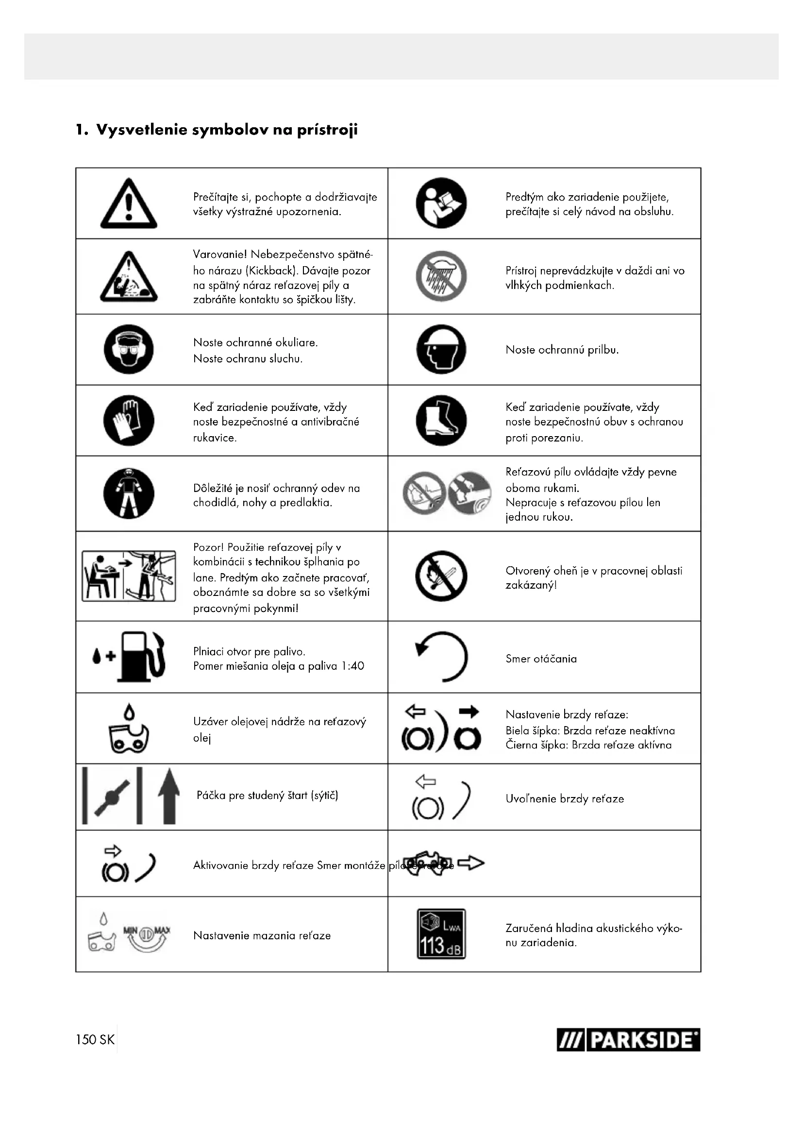 VAROVANIE: Pred prvým uvedením do prevádzky si dôkladne prečítajte tento návod na obsluhu a bezpodmienečne do- držiavajte bezpečnostné predpisy! Pílu na orezávanie stromov smie obsluhovať len „pracovník určený na ošetrovanie stromov s dodatočným školením pre prácu v zdvíhacích košoch alebo na požiarnych rebríkoch s košom alebo pre lanovú lezeckú techniku“! Návod na obsluhu uchovávajte na bezpečnom mieste! Upozornenie: Zohľadnite, prosím, že niektoré národné predpisy by mohli obmedziť používanie stroja. Táto píla na orezávanie stromov je špeciálne určená na starostlivosť o stromy a orezávanie stromov. Všetky práce s pílou na orezávanie stromov sú špeciálne určené na starostlivosť o stromy a orezávanie stromov. Všetky práce s touto pílou na orezávanie stromov smú vykonávať len vyškolení pracovníci určení na ošetrovanie stromov!152 SK