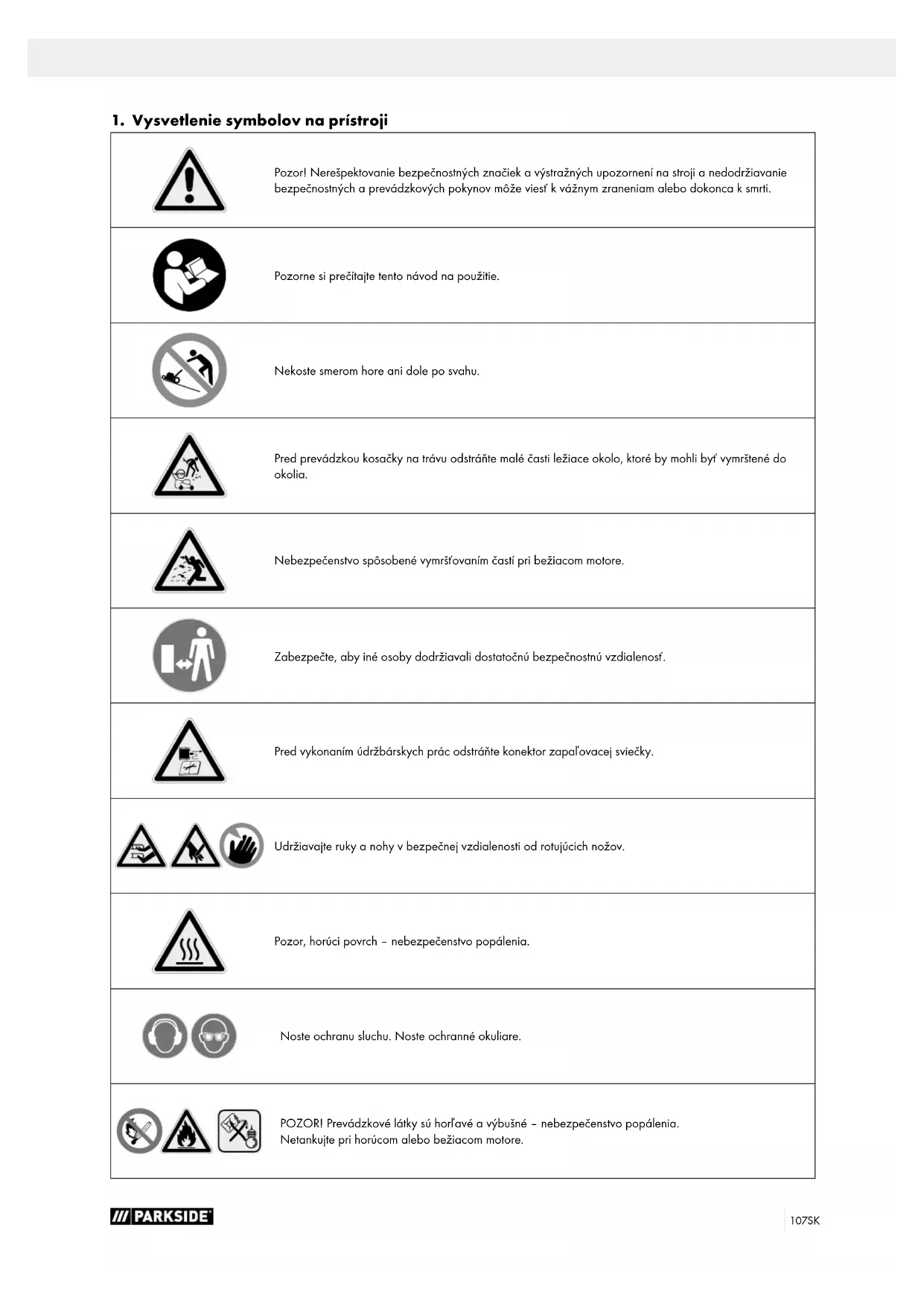 Pozor! Nerešpektovanie bezpečnostných značiek a výstražných upozornení na stroji a nedodržiavanie bezpečnostných a prevádzkových pokynov môže viesť k vážnym zraneniam alebo dokonca k smrti. Pozorne si prečítajte tento návod na použitie. Nekoste smerom hore ani dole po svahu. Pred prevádzkou kosačky na trávu odstráňte malé časti ležiace okolo, ktoré by mohli byť vymrštené do okolia. Nebezpečenstvo spôsobené vymršťovaním častí pri bežiacom motore. Zabezpečte, aby iné osoby dodržiavali dostatočnú bezpečnostnú vzdialenosť. Pred vykonaním údržbárskych prác odstráňte konektor zapaľovacej sviečky. Udržiavajte ruky a nohy vbezpečnej vzdialenosti od rotujúcich nožov. Pozor, horúci povrch – nebezpečenstvo popálenia. Noste ochranu sluchu. Noste ochranné okuliare. POZOR! Prevádzkové látky sú horľavé avýbušné–nebezpečenstvo popálenia. Netankujte pri horúcom alebo bežiacom motore.108 SK Objem nádrže Motorový olej