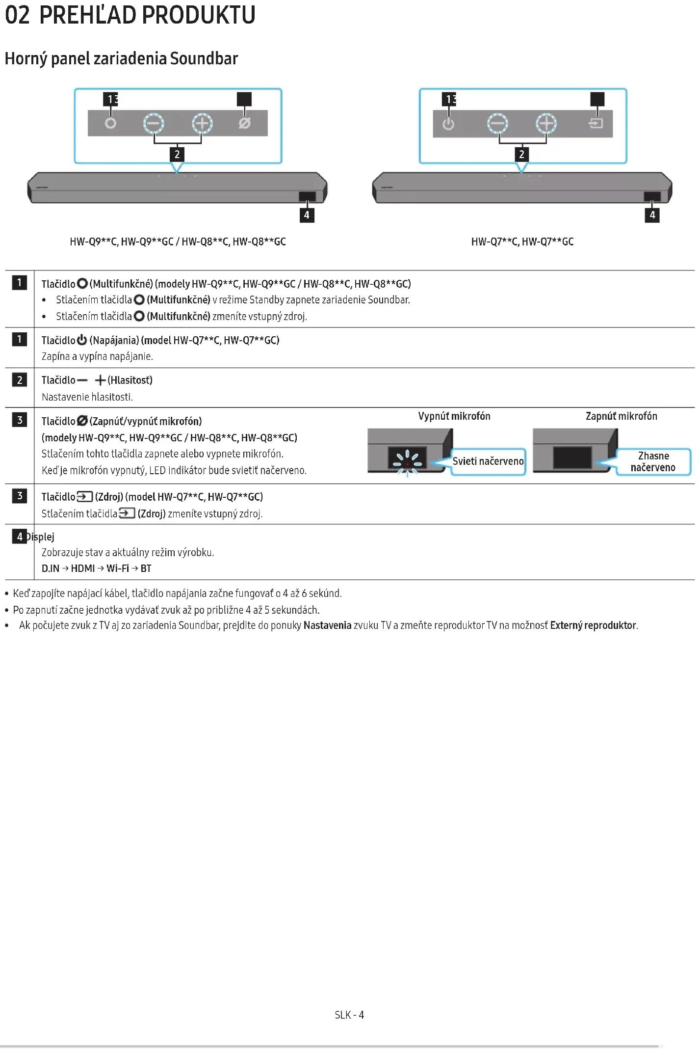 SOUNDBAR PRED TELEVÍZOROM Súčasť x 4 Gumená pätka Pri inštalácii pripevnite gumené pätky na spodnú stranu zariadenia Soundbar a umiestnite ho na svoje miesto nad stojanom televízora. Dbajte na to, aby ste gumené nožičky pripojili tak, aby ich nebolo spod okraja stojana TV vidno. Pozrite si obrázok zobrazený nižšie. Gumená pätka Zariadenie Soundbar umiestnite na stojan televízora. Mikrofóny (iba pre príslušné modely)SLK - 31 Podľa znázornenia na obrázku zarovnajte stred zariadenia Soundbar so stredom televízora a zariadenie Soundbar opatrne umiestnite na stojan televízora. Teraz umiestnite mikrofóny (iba pre príslušné modely) na prednú stranu stojana, aby nerušili rozpoznávanie hlasu. Pravý koniec zariadenia Soundbar