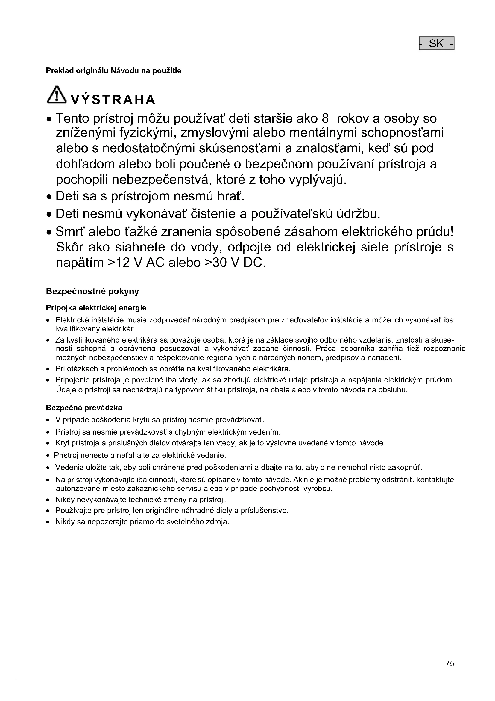 - Na prístroji vykonávajte iba činnosti, ktoré sú opísané v tomto návode. Ak nie je možné problémy odstrániť, kontaktujte autorizované miesto zákazníckeho servisu alebo v prípade pochybností výrobcu.