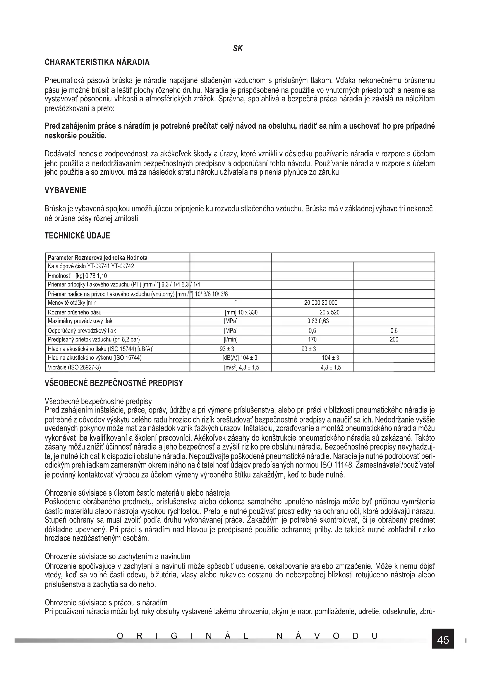 Pneumatická pásová brúska je náradie napájané stlačeným vzduchom s príslušným tlakom. Vďaka nekonečnému brúsnemu pásu je možné brúsiť a leštiť plochy rôzneho druhu. Náradie je prispôsobené na použitie vo vnútorných priestoroch a nesmie sa vystavovať pôsobeniu vlhkosti a atmosférických zrážok. Správna, spoľahlivá a bezpečná práca náradia je závislá na náležitom prevádzkovaní a preto: Pred zahájením práce s náradím je potrebné prečítať celý návod na obsluhu, riadiť sa ním a uschovať ho pre prípadné neskoršie použitie. Dodávateľ nenesie zodpovednosť za akékoľvek škody a úrazy, ktoré vznikli v dôsledku používanie náradia v rozpore s účelom jeho použitia a nedodržiavaním bezpečnostných predpisov a odporúčaní tohto návodu. Používanie náradia v rozpore s účelom jeho použitia a so zmluvou má za následok stratu nároku užívateľa na plnenia plynúce zo záruku. VYBAVENIE Brúska je vybavená spojkou umožňujúcou pripojenie ku rozvodu stlačeného vzduchu. Brúska má v základnej výbave tri nekoneč- né brúsne pásy rôznej zrnitosti. TECHNICKÉ ÚDAJE Parameter Rozmerová jednotka Hodnota Katalógové číslo YT-09741 YT-09742 Hmotnosť [kg] 0,78 1,10 Priemer prípojky tlakového vzduchu (PT) [mm / ”] 6,3 / 1/4 6,3 / 1/4 Priemer hadice na prívod tlakového vzduchu (vnútorný) [mm / ”] 10/ 3/8 10/ 3/8 Menovité otáčky [min