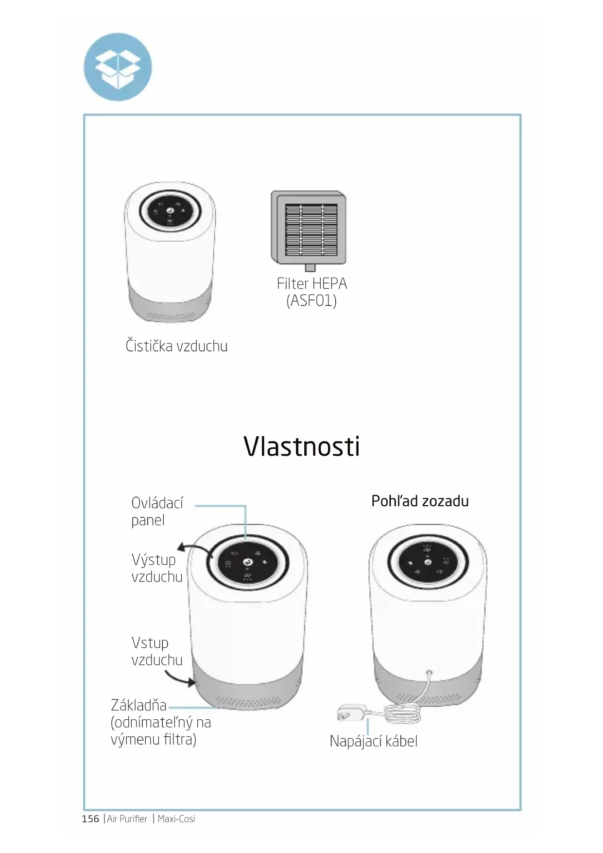 Maxi-Cosi Vlastnosti Čistička vzduchu Filter HEPA (ASF01) Základňa (odnímateľný na výmenu filtra) Ovládací panel Pohľad zozadu Vstup vzduchu Výstup vzduchu Napájací kábelMaxi-Cosi