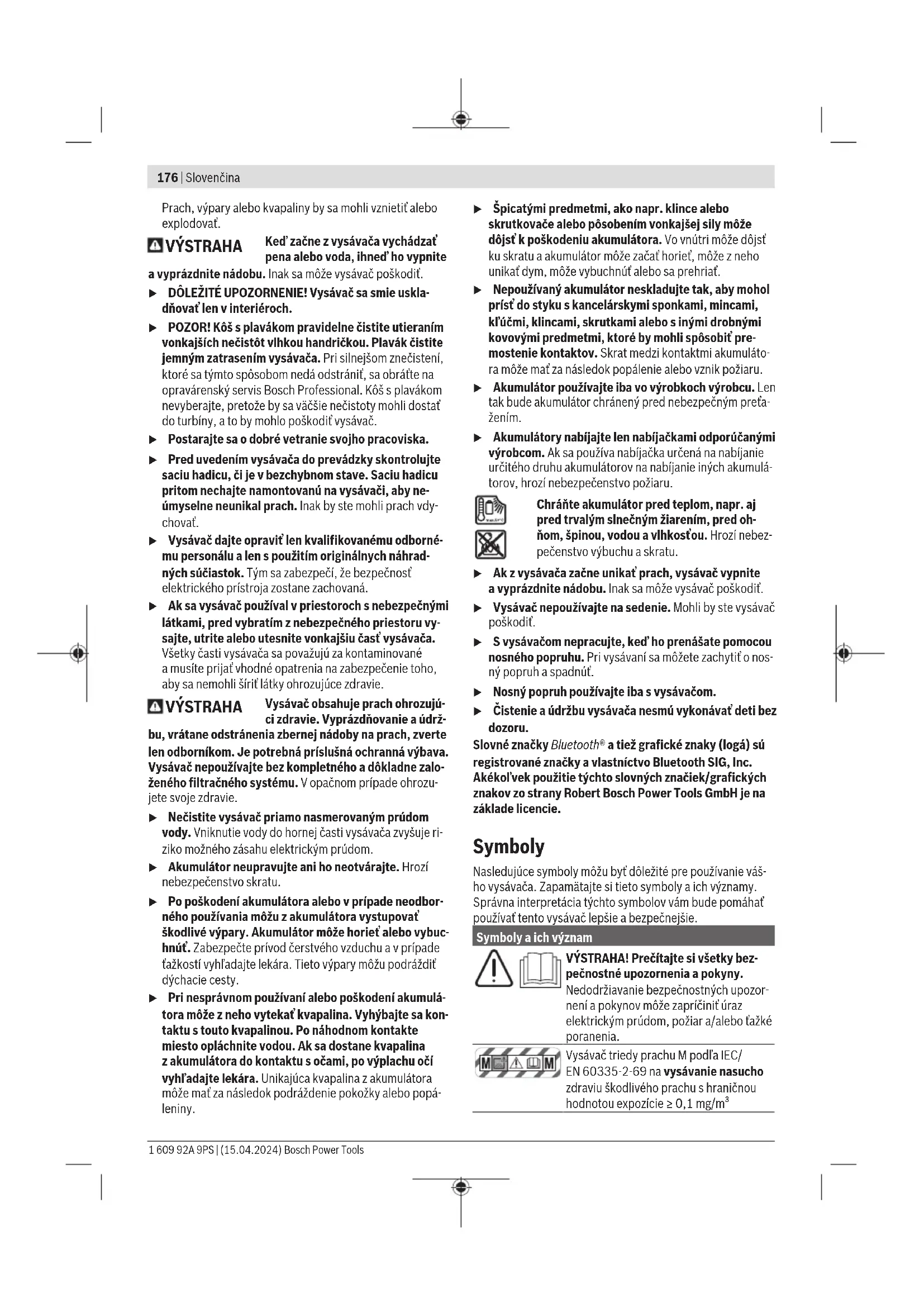 Merané so sacou hadicou(20) aohnutou dýzou(22) C) Vzávislosti od použitého akumulátora D) Obmedzený výkon pri teplotách <0°C. E) Mobilné koncové zariadenia musia byť kompatibilné so za- riadeniami Bluetooth®-Low-Energy (verzia 4.2) amusia podpo- rovať Generic Access Profile (GAP). F) Dosah sa môže výrazne líšiť vzávislosti od vonkajších pod- mienok, vrátane použitého prijímacieho zariadenia. Vuzavre- tých priestoroch acez kovové prekážky (napr. steny, police, kuf- re atď.) môže byť dosah Bluetooth® výrazne menší. Hodnoty sa môžu líšiť podľa výrobku azávisia od podmienok použitia aprostredia. Ďalšie informácie na adrese www.bosch-professional.com/wac. Informácia ohlučnosti/vibráciách Hodnoty emisií hluku zistené podľaEN60335‑2‑69. Hladina akustického tlaku vysávača pri použití váhového fil- tra Aje typicky79 dB(A). NeistotaK= 2dB. Úroveň hluku pri práci môže prekročiť uvedené hodnoty. Noste prostried- ky na ochranu sluchu! Celkové hodnoty vibrácií a