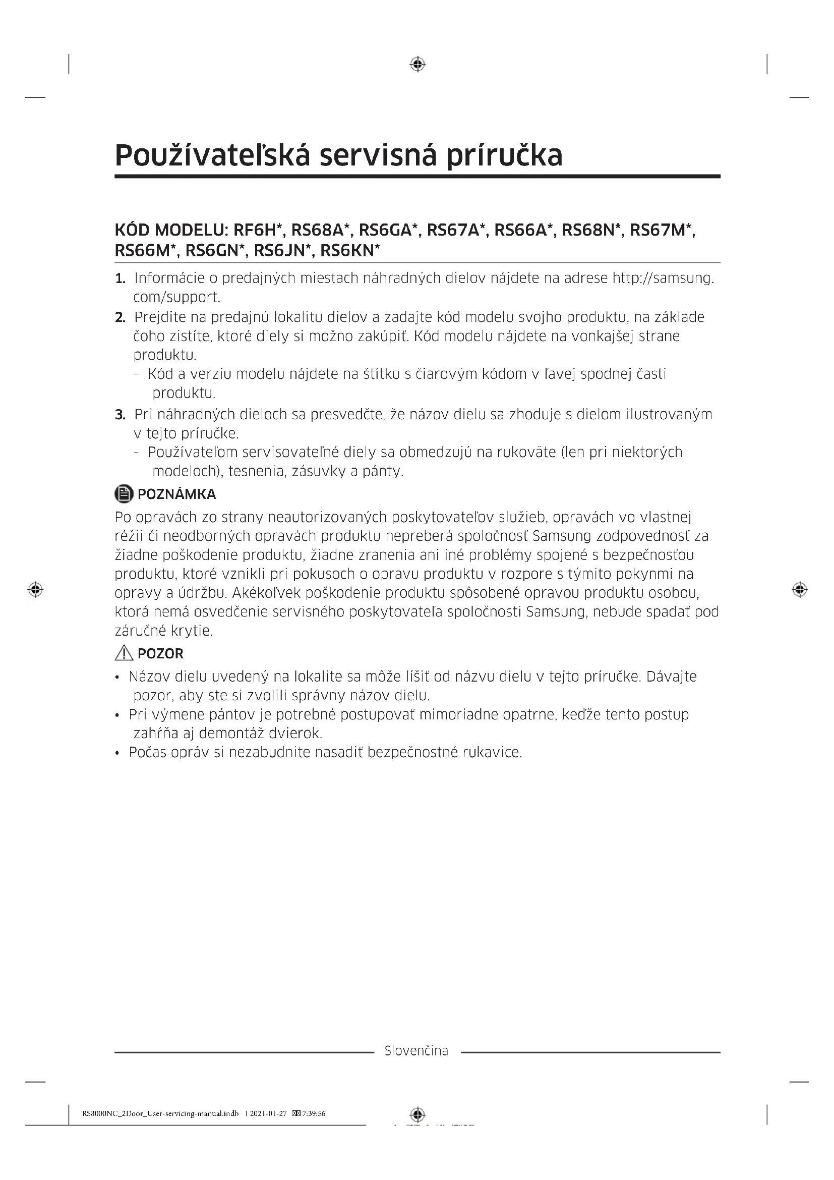 - Počas opráv si nezabudnite nasadiť bezpečnostné rukavice. RS8000NC_2Door_User-servicing-manual.indb 1 2021-01-27 7:39:56Slovenčina Skutočný vzhľad a uvedené diely chladničky sa môžu líšiť v závislosti od modelu a krajiny.