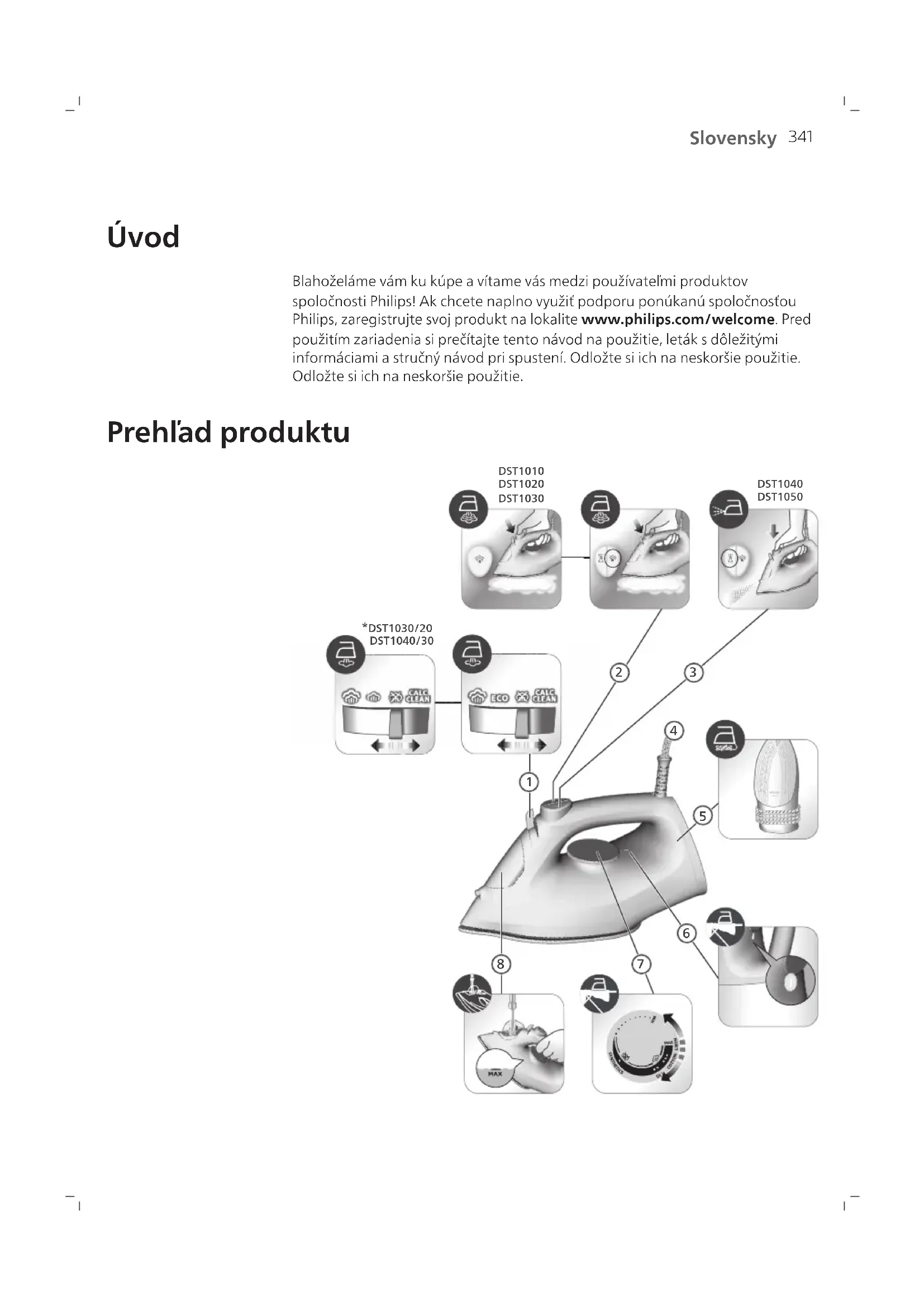 Úvod Blahoželáme vám ku kúpe avítame vás medzi používateľmi produktov spoločnosti Philips! Ak chcete naplno využiť podporu ponúkanú spoločnosťou Philips, zaregistrujte svoj produkt na lokalite www.philips.com/welcome. Pred použitím zariadenia si prečítajte tento návod na použitie, leták s dôležitými informáciami a stručný návod pri spustení. Odložte si ich na neskoršie použitie. Odložte si ich na neskoršie použitie. Prehľad produktu