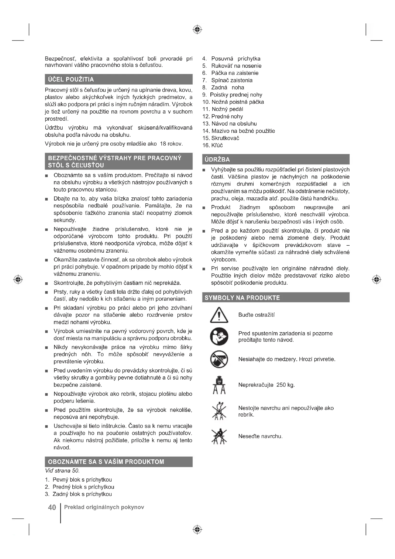 Pracovný stôl s čeľusťou je určený na upínanie dreva, kovu, plastov alebo akýchkoľvek iných fyzických predmetov, a slúži ako podpora pri práci s iným ručným náradím. Výrobok je tiež určený na použitie na rovnom povrchu a v suchom prostredí. Údržbu výrobku má vykonávať skúsená/kvalifi kovaná obsluha podľa návodu na obsluhu. Výrobok nie je určený pre osoby mladšie ako 18 rokov.