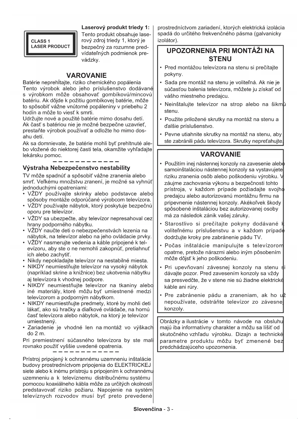 Slovenčina - 3 - CLASS 1 LASER PRODUCT Laserový produkt triedy 1: Tento produkt obsahuje lase- rový zdroj triedy 1, ktorý je bezpečný za rozumne pred- vídateľných podmienok pre- vádzky. VAROVANIE Batérie neprehĺtajte, riziko chemického popálenia Tento výrobok alebo jeho príslušenstvo dodávané s výrobkom môže obsahovať gombíkovú/mincovú batériu. Ak dôjde k požitiu gombíkovej batérie, môže to spôsobiť vážne vnútorné popáleniny v priebehu 2 hodín a môže to viesť k smrti. Udržujte nové a použité batérie mimo dosahu detí. Ak časť s batériou nie je možné bezpečne uzavrieť, prestaňte výrobok používať a odložte ho mimo dos- ahu detí. Ak sa domnievate, že batérie mohli byť prehltnuté ale- bo vložené do niektorej časti tela, okamžite vyhľadajte lekársku pomoc. – – – – – – – – – – – – Výstraha Nebezpečenstvo nestability TV môže spadnúť a spôsobiť vážne zranenia alebo smrť. Veľkému množstvu zranení, je možné sa vyhnúť jednoduchými opatreniami: