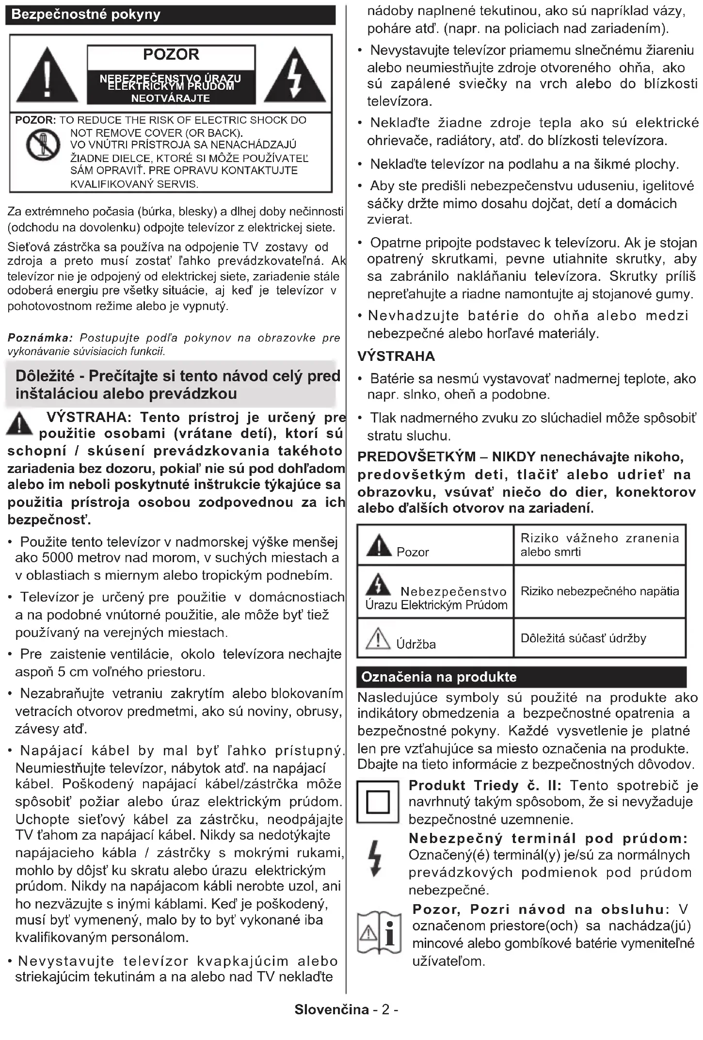 - Tlak nadmerného zvuku zo slúchadiel môže spôsobiť stratu sluchu. PREDOVŠETKÝM – NIKDY nenechávajte nikoho, predovšetkým deti, tlačiť alebo udrieť na obrazovku, vsúvať niečo do dier, konektorov alebo ďalších otvorov na zariadení. Pozor Riziko vážneho zranenia alebo smrti Nebezpečenstvo Úrazu Elektrickým Prúdom Riziko nebezpečného napätia Údržba Dôležitá súčasť údržby Označenia na produkte Nasledujúce symboly sú použité na produkte ako indikátory obmedzenia a bezpečnostné opatrenia a bezpečnostné pokyny. Každé vysvetlenie je platné len pre vzťahujúce sa miesto označenia na produkte. Dbajte na tieto informácie z bezpečnostných dôvodov. Produkt Triedy č. II: Tento spotrebič je navrhnutý takým spôsobom, že si nevyžaduje bezpečnostné uzemnenie. Nebezpečný terminál pod prúdom: Označený(é) terminál(y) je/sú za normálnych prevádzkových podmienok pod prúdom nebezpečné.