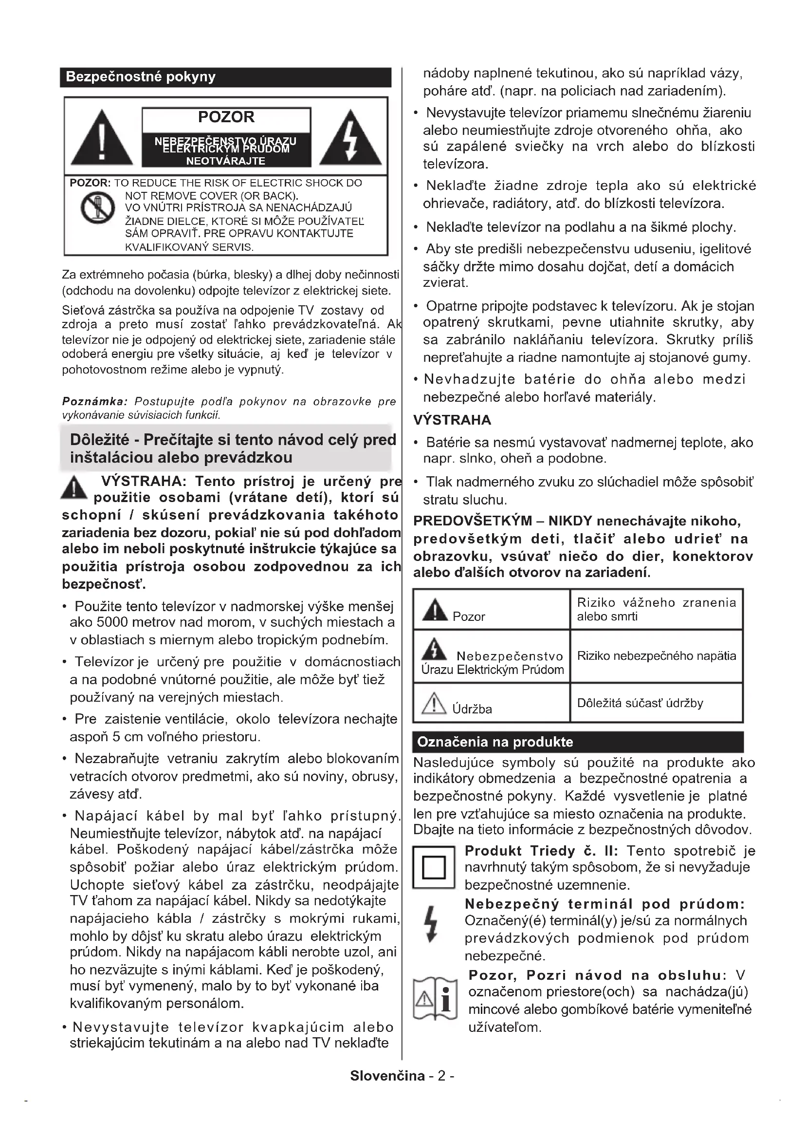 - Tlak nadmerného zvuku zo slúchadiel môže spôsobiť stratu sluchu. PREDOVŠETKÝM – NIKDY nenechávajte nikoho, predovšetkým deti, tlačiť alebo udrieť na obrazovku, vsúvať niečo do dier, konektorov alebo ďalších otvorov na zariadení. Pozor Riziko vážneho zranenia alebo smrti Nebezpečenstvo Úrazu Elektrickým Prúdom Riziko nebezpečného napätia Údržba Dôležitá súčasť údržby Označenia na produkte Nasledujúce symboly sú použité na produkte ako indikátory obmedzenia a bezpečnostné opatrenia a bezpečnostné pokyny. Každé vysvetlenie je platné len pre vzťahujúce sa miesto označenia na produkte. Dbajte na tieto informácie z bezpečnostných dôvodov. Produkt Triedy č. II: Tento spotrebič je navrhnutý takým spôsobom, že si nevyžaduje bezpečnostné uzemnenie. Nebezpečný terminál pod prúdom: Označený(é) terminál(y) je/sú za normálnych prevádzkových podmienok pod prúdom nebezpečné.