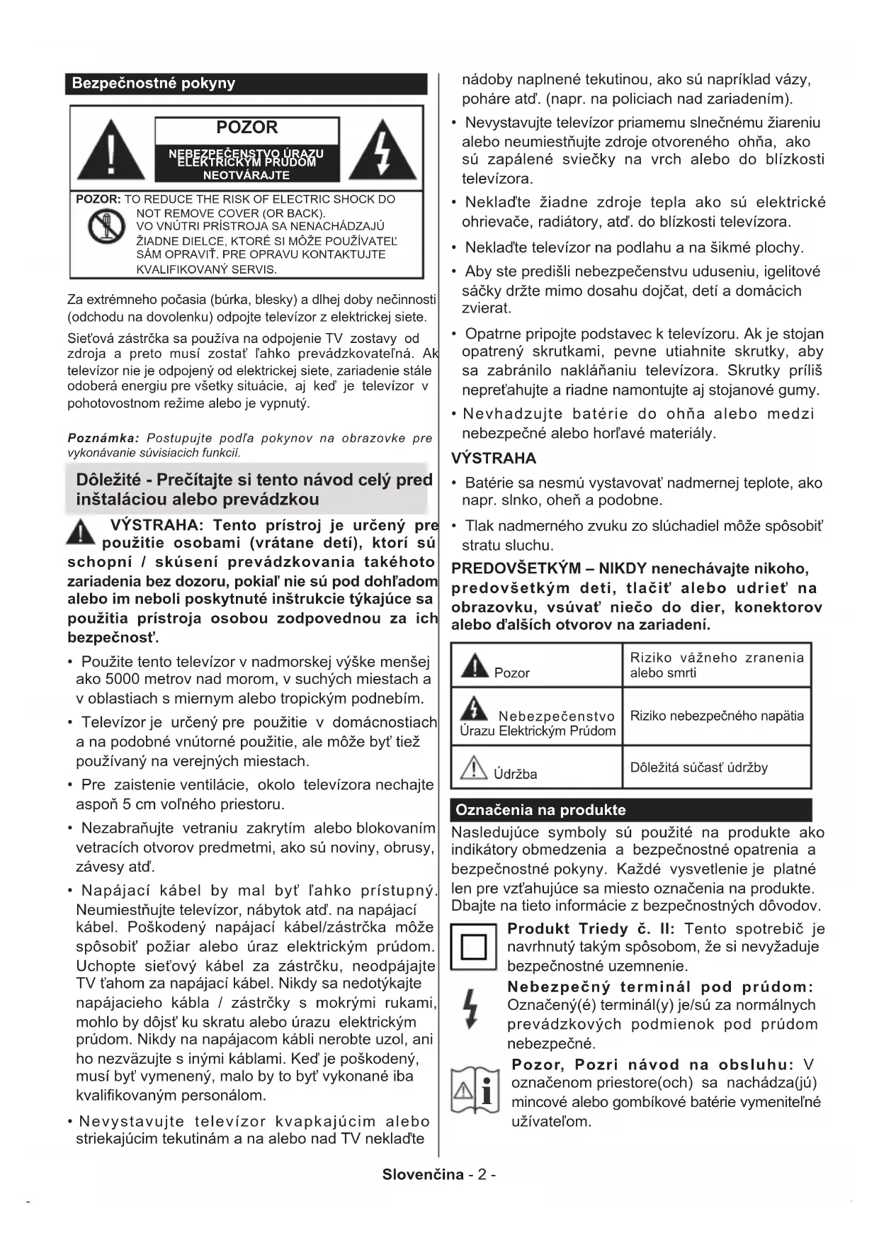 - Tlak nadmerného zvuku zo slúchadiel môže spôsobiť stratu sluchu. PREDOVŠETKÝM – NIKDY nenechávajte nikoho, predovšetkým deti, tlačiť alebo udrieť na obrazovku, vsúvať niečo do dier, konektorov alebo ďalších otvorov na zariadení. Pozor Riziko vážneho zranenia alebo smrti Nebezpečenstvo Úrazu Elektrickým Prúdom Riziko nebezpečného napätia Údržba Dôležitá súčasť údržby Označenia na produkte Nasledujúce symboly sú použité na produkte ako indikátory obmedzenia a bezpečnostné opatrenia a bezpečnostné pokyny. Každé vysvetlenie je platné len pre vzťahujúce sa miesto označenia na produkte. Dbajte na tieto informácie z bezpečnostných dôvodov. Produkt Triedy č. II: Tento spotrebič je navrhnutý takým spôsobom, že si nevyžaduje bezpečnostné uzemnenie. Nebezpečný terminál pod prúdom: Označený(é) terminál(y) je/sú za normálnych prevádzkových podmienok pod prúdom nebezpečné.