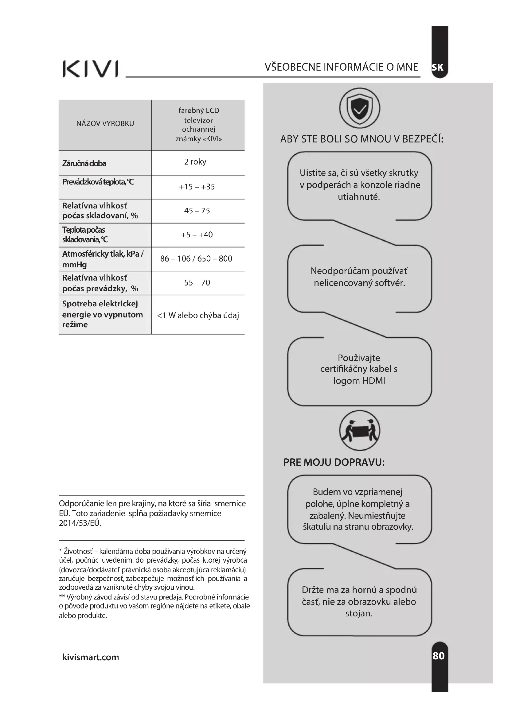 farebný LCD televízor ochrannej známky «KIVI» Záručná doba 2 roky Prevádzková teplota, °C +15 – +35 Relatívna vlhkosť počas skladovaní, % 45 – 75 Teplota počas skladovania, °C +5 – +40 Atmosféricky tlak, kPa / mmHg 86 – 106 / 650 – 800 Relatívna vlhkosť počas prevádzky, % 55 – 70 Spotreba elektrickej energie vo vypnutom režime <1 W alebo chýba údajUPOZORNENIA!