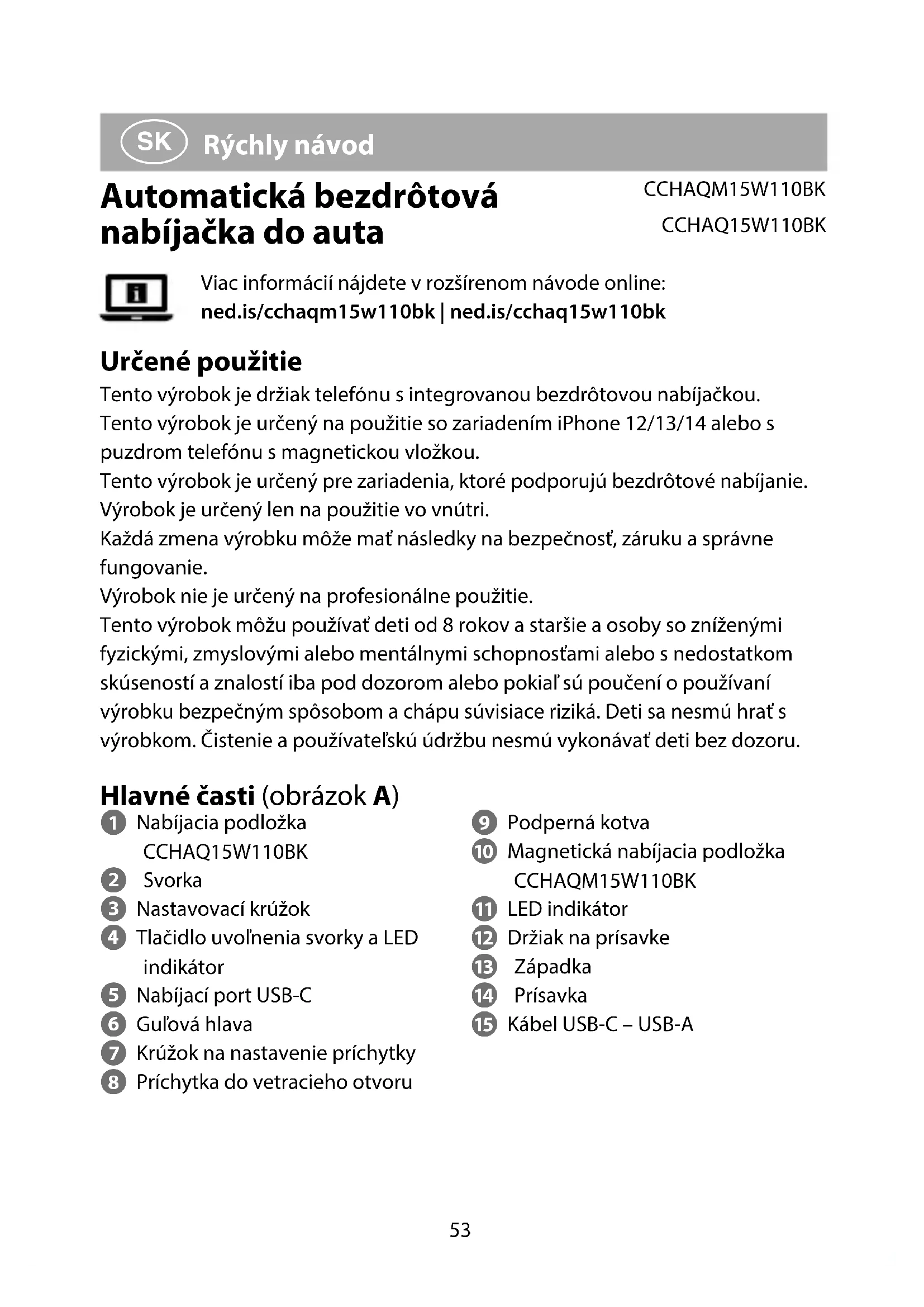 Viac informácií nájdete v rozšírenom návode online: ned.is/cchaqm15w110bk | ned.is/cchaq15w110bk Určené použitie Tento výrobok je držiak telefónu s integrovanou bezdrôtovou nabíjačkou. Tento výrobok je určený na použitie so zariadením iPhone 12/13/14 alebo s puzdrom telefónu s magnetickou vložkou. Tento výrobok je určený pre zariadenia, ktoré podporujú bezdrôtové nabíjanie. Výrobok je určený len na použitie vo vnútri. Každá zmena výrobku môže mať následky na bezpečnosť, záruku a správne fungovanie. Výrobok nie je určený na profesionálne použitie. Tento výrobok môžu používať deti od 8 rokov a staršie a osoby so zníženými fyzickými, zmyslovými alebo mentálnymi schopnosťami alebo s nedostatkom skúseností a znalostí iba pod dozorom alebo pokiaľ sú poučení o používaní výrobku bezpečným spôsobom a chápu súvisiace riziká. Deti sa nesmú hrať s výrobkom. Čistenie a používateľskú údržbu nesmú vykonávať deti bez dozoru. Hlavné časti (obrázok A) 1 Nabíjacia podložka